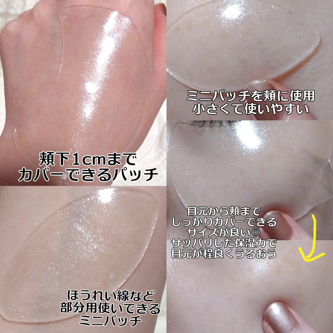 - ●話題の注目成分、グルタチオンとナイアシンアミド配合 2つの成分で乾燥を防ぎ、肌のコンディションを整えます。 ●目元に密着する大きめパッチと、口周りもケアできる小さめパッチの2種類の形状 気になる箇所にピタッと密着して光彩肌に導きます。