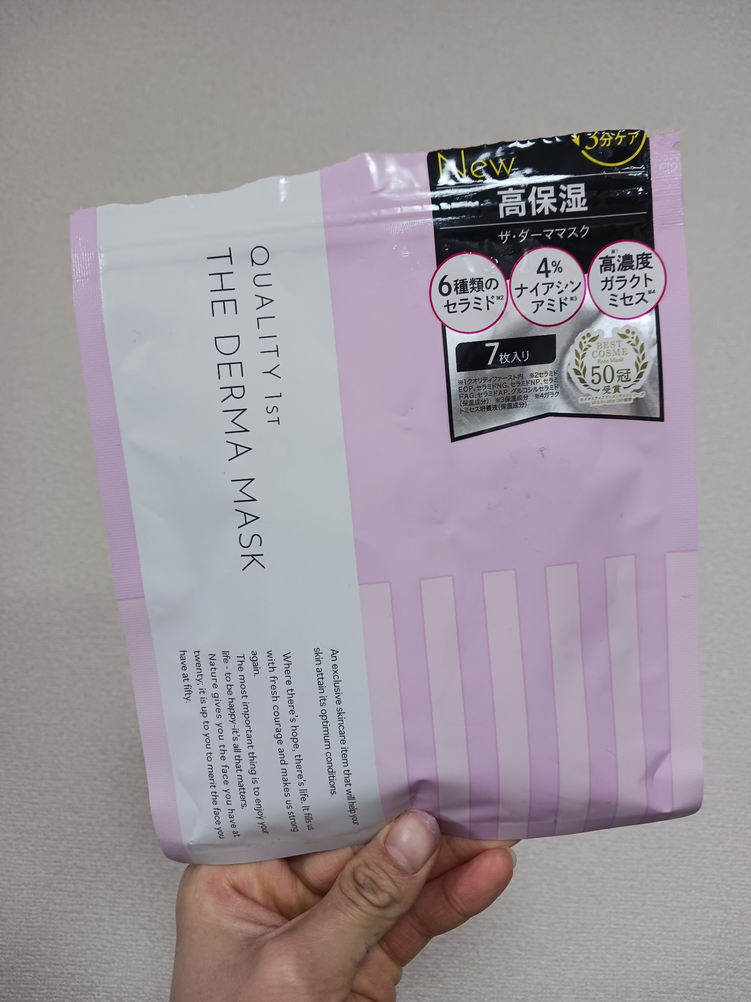 クオリティファースト、ザ・ダーママスク7枚。保湿目的で購入。洗顔後に使用するタイプ。3分でもしっかり仕事してくれる、時短ケアマスク。ベタベタせず、適度なしっとり感があり、満足の仕上がり。香りも爽やかで清潔感があり好き。シートのフィット感はダー...