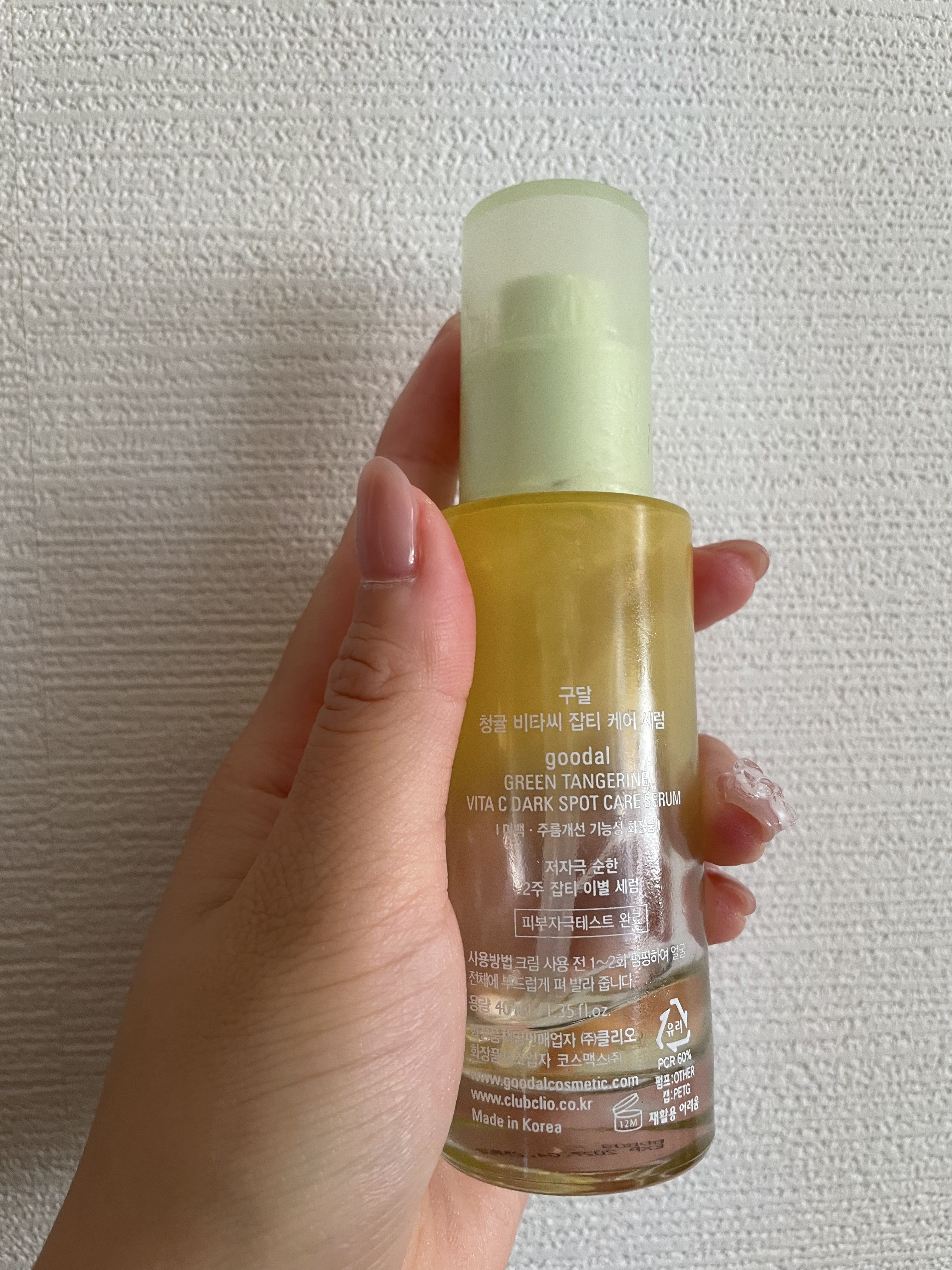 - ◆グーダル グリーンタンジェリンビタCダークスポットケアセラム 40ml 累積販売数:650万個*1 グーダルならではの厳格な基準*2を通過したこだわりの新鮮な済州無農薬青ミカンを直接収穫してAir Bubble Brewing工法で抽出 。生き生きとした印象の肌に。青みかんエキス(タンジェリンエキス)70%配合。乾燥によるくすみをケアし、透明感のある肌に導きます。 お肌のキメを整えるための整肌成分であるビタミンB3(ナイアシンアミド)が既存のグーダルグリーンタンジェリンビタCシミセラムプラスの2倍である4%になりました。 *1:2018.02~2023.09 全チャンネル販売数量基準|リニューアル製品を含む *2:7月中旬から8月中旬の間に獲れたての青ミカンの鮮度を現場ですぐに評価して選別し、超低温で管理、低い温度から直接抽出する青みかんエキス(整肌成分) <酸度>:㏗測定器、リトマス紙使用/酸度3.0~4.0かを確認 <果皮水分含量>:鮮度評価指標で皮の水分含量を測定