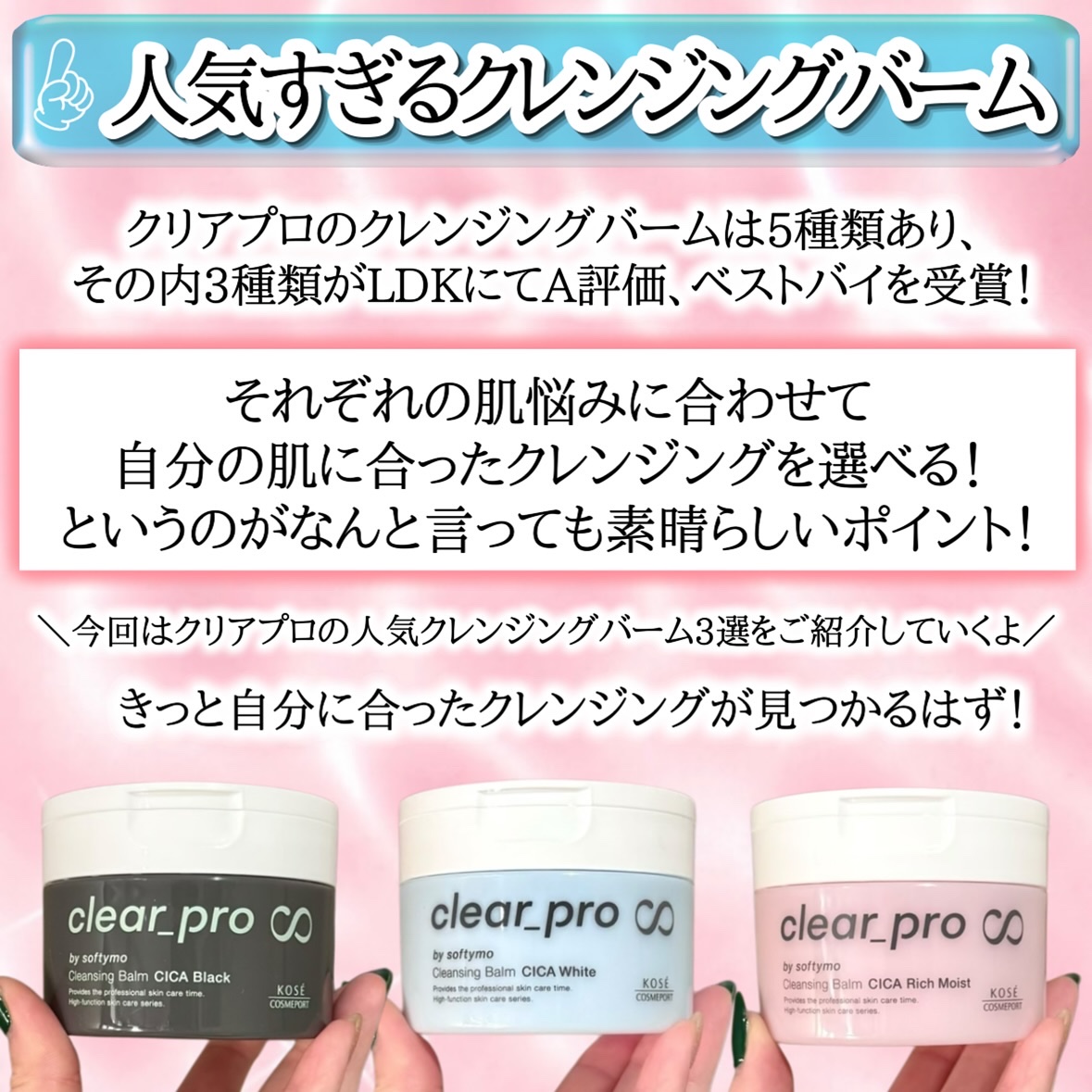 LDKで高評価のソフティモのクレンジングバームをご紹介🎶 クリアプロはオイルタイプもあって、リピートしてるくらい好きなクレンジングやからバームタイプも期待して使用😼🩷 まず何が好きかって、「するん落ち」なんよ。 メイクを落とす力がしっかりあってポイントメイクも落ちた🫢 ツボクサエキス・厳選保湿成分・5種の植物油脂が配合されてる👍
