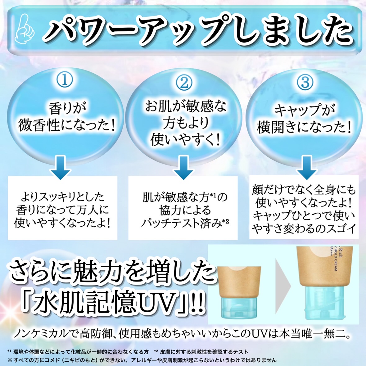 - ※2024年3月から、一部のドラッグストアで先行発売。2025年2月8日より全国発売開始。 アクアリッチシリーズ初のノンケミカルUV(紫外線吸収剤フリー)! アクアリッチウォータリーホールドクリーム(水肌記憶UV)。 約2兆個*のアクアカプセルが水を抱え込んだ膜を形成。 ✔強力紫外線をカット(SPF50/PA+++) ✔長時間肌の水分を逃がさないから、みずみずしさつづく。 もっちり水感クリーム。圧迫感の少ない軽い付け心地。 <肌を想ったこだわり> ・ノンケミカル処方(紫外線吸収剤フリー) ・アルコールフリー ・酸化亜鉛フリー ・パラベンフリー ・着色料フリー ・せっけんで落とせる *顔1回使用量の目安(0.4g)あたり
