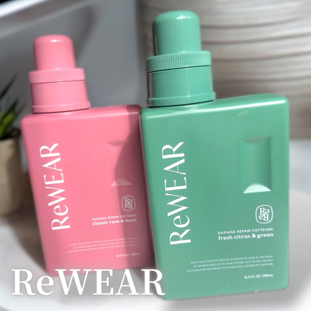 人気シャントリブランド「BOTANIST」の会社が手がける新柔軟剤ブランド『ReWEAR(リウェア)』 洗うたびに衣服をよみがえらせる※再生柔軟剤リウェアは、特徴成分であるセルラーゼ(酵素成分)のちからで毛羽立ちや毛玉を分解・除去し、色くすみも抑え、長く着続けるための衣類ケアができる柔軟剤です。 どちらも香りが良く、緑はすっきりした香り、ピンクは甘いムスクの香りがいい香り♡