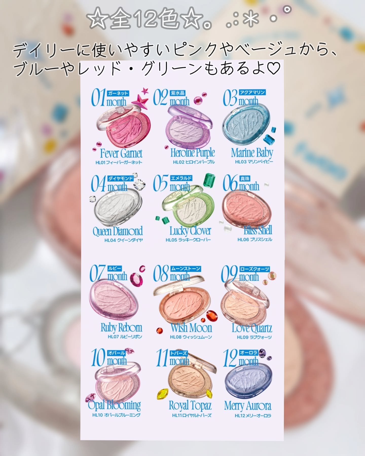 誕生石からインスピレーションを得た、デイリーからホリデーまで使える煌めく12色のハイライター🫧✨ 上品な濡れツヤ感が出てお気に入り🤍2つを合わせ使いすることで自分だけのレシピを見つけるのも楽しい! 誕生石モチーフだから、生まれた月や願いごとに合わせて自分だけのハイライターを選ぶのもおすすめ💎.*