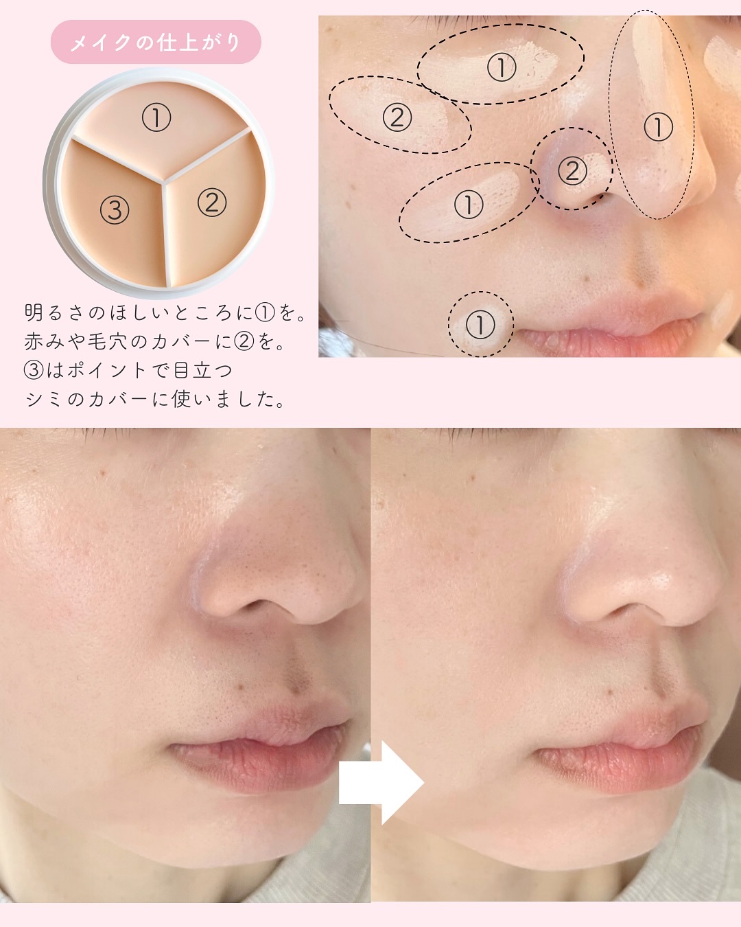 - クマからニキビ跡、シミまでこれ1つでカバー。 3色タイプだからこそ、気になるところや肌色を選ばずにご使用いただけます。 リキッドタイプを圧縮した高濃度バームのため高カバー高密着*¹を実現。 コンシーラーだけでなくコントアとしても使用可能です。 *1メーカー比