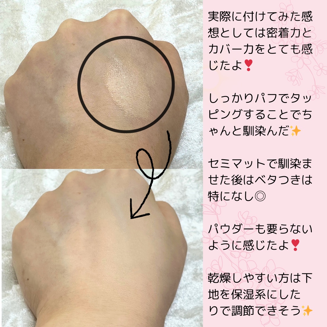 ドクダミエキスたっぷり含んだスキンケアクッションなのに、カバー力&密着力が高く赤み等の肌悩みを隠してくれるところが一押しです🫶 セミマットでベタつき無く、パウダー無しでもよさそうです🙆♀️ 密着力の高さとUVケアできる点で夏場は崩れを気にせず使えそうだなと感じました🥰