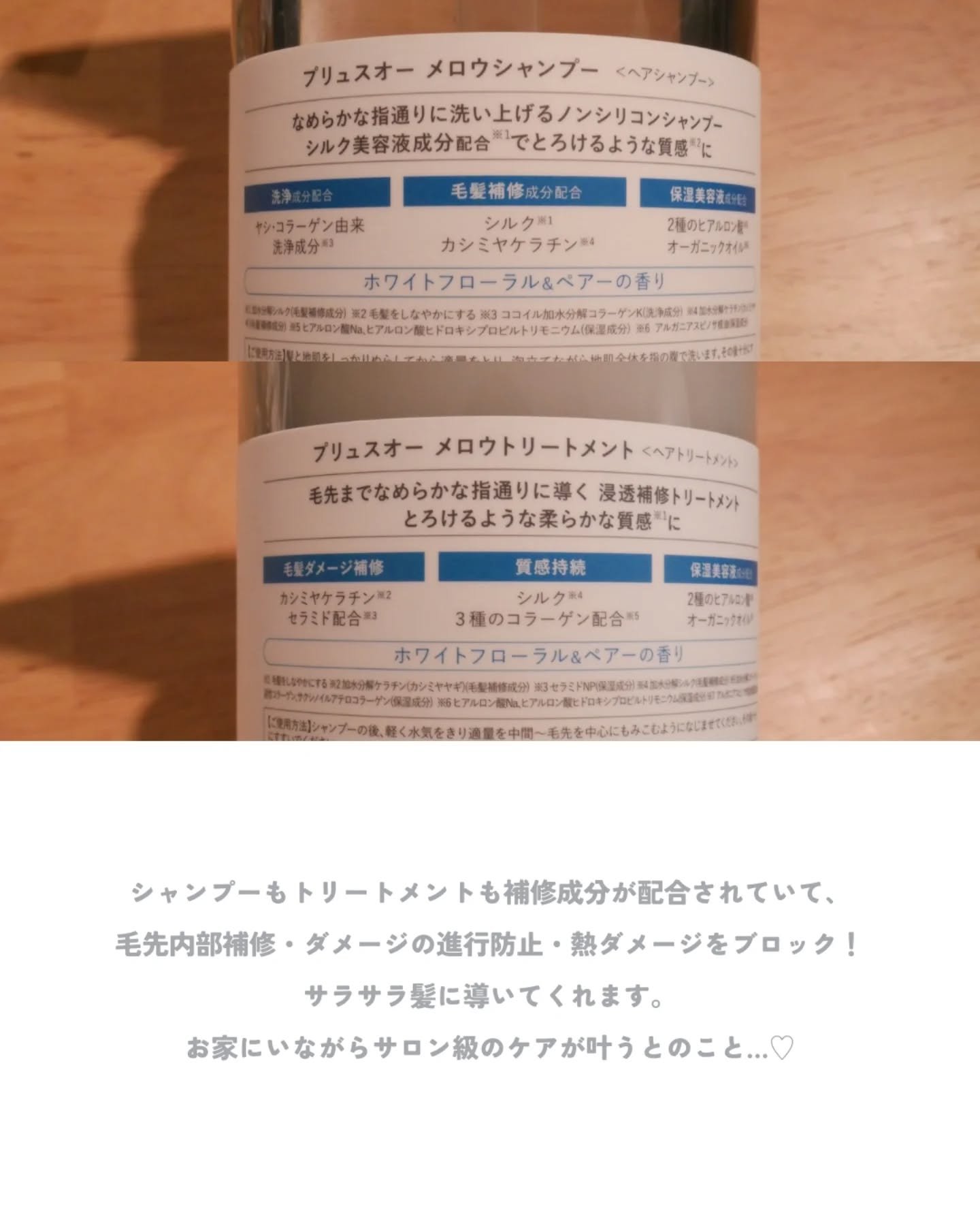 「カシミヤ由来のケラチン」をはじめとした3種のケラチン、シルクPPT、コラーゲンPPT、CMC類似成分配合だけではなく、セラミド、ヒアルロン酸、オーガニックオイルなどの美容保湿成分を浸透させ密封補修。 とぅるっとぅるな洗い心地のシャンプー! きめ細かく濃厚な泡で、地肌をこすらず優しく洗えました👏 トリートメントは、こっくりとしっかりとしたテクスチャで髪にしっかり密着してくれます。