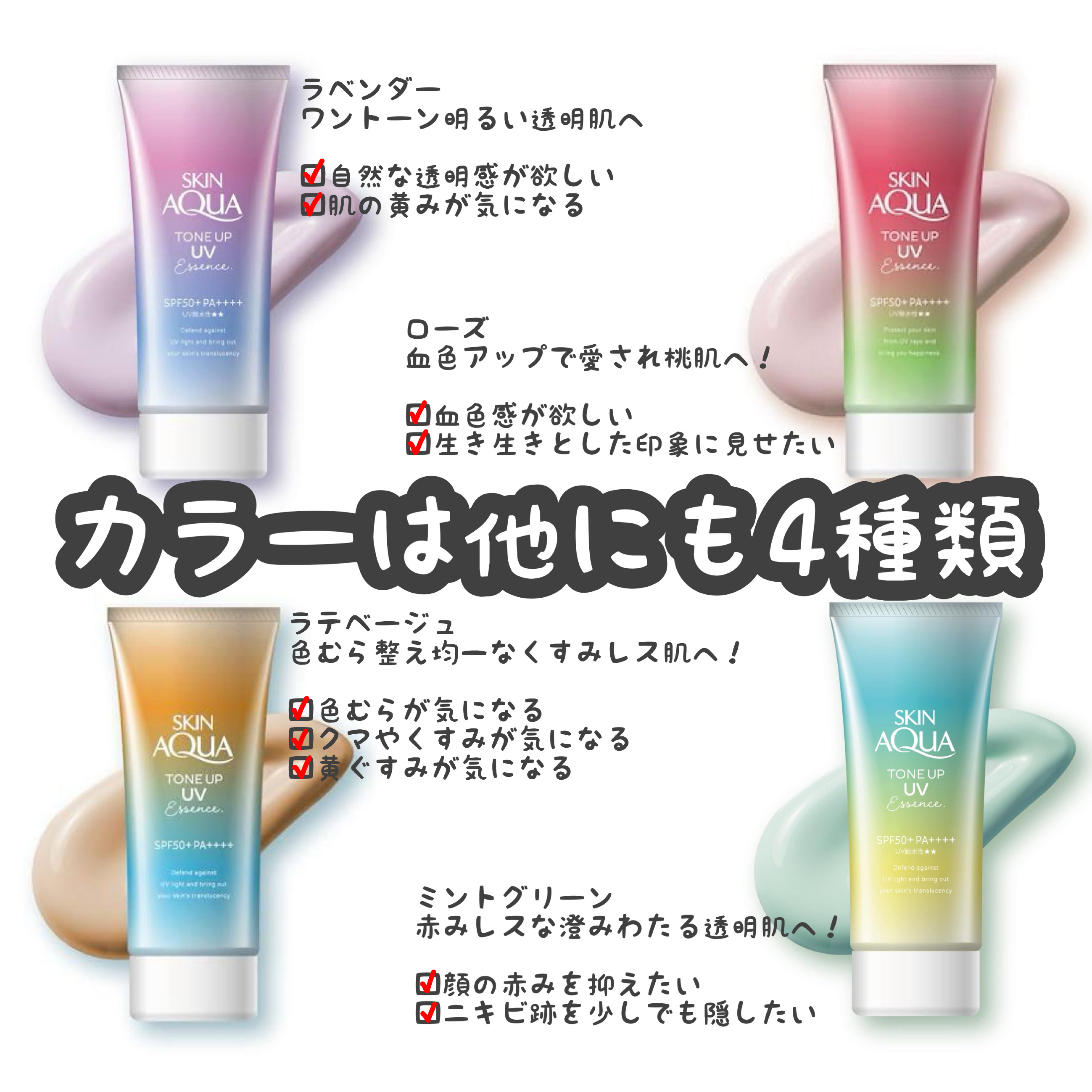 - ※カラー名称「ハピネスオーラ」は「ローズ」へ名称変更となりました。 <ミントグリーン> 赤み補正*1!UVカットしながら、色と光をコントロールし、肌をトーンアップ*1。 ミントグリーンカラーで透き通るような素肌つづく!エッセンスタイプの日焼け止め。 透明感*1のある肌に。 SPF50+、PA++++、UV耐水性★★。 鉱物油フリー。パラベンフリー。ときめくサボンの香り。 <ラベンダー> 明るさ補正*1!UVカットしながら、色と光をコントロールし、肌をトーンアップ*1。 透明感*1を引き出すラベンダーカラーの日焼け止め。 すーっとのびて、みずみずしい使い心地のエッセンスタイプ。 SPF50+、PA++++、UV耐水性★★。 鉱物油フリー。パラベンフリー。ときめくサボンの香り。 <ローズ> 血色感補正*1!UVカットしながら、色と光をコントロールし、肌をトーンアップ*1。 ローズカラーで血色をプラスし、透明感*1のある肌に。 エッセンスタイプの日焼け止め。 SPF50+、PA++++、UV耐水性★★。 パラベンフリー。ハピネスブロッサムの香り。 <ブルー> UVカットしながら、色と光をコントロールし、肌をトーンアップ*1。 血色感を抑えて儚げな色白肌*1に見せるブルーカラーの顔・からだ用日やけ止め。すーっとのびて、みずみずしい使い心地。 透明感ブルー×透明感ホワイト=はかなげブルーカラーで、自分史上最高*2の色白肌*1、うるおう美容液成分(うるおい成分)としてヒアルロン酸Na、ビタミンC誘導体*3配合。 SPF50+/PA++++。こころがときめくサボンの香り。化粧下地にも。石けんで落とせます。 パラベンフリー。鉱物油フリー。アレルギーテスト済み(全ての方にアレルギーが起こらないというわけではありません)。 *1:メイクアップ効果による *2:スキンアクアシリーズにおいて *3:リン酸アスコルビルMg(うるおい成分)