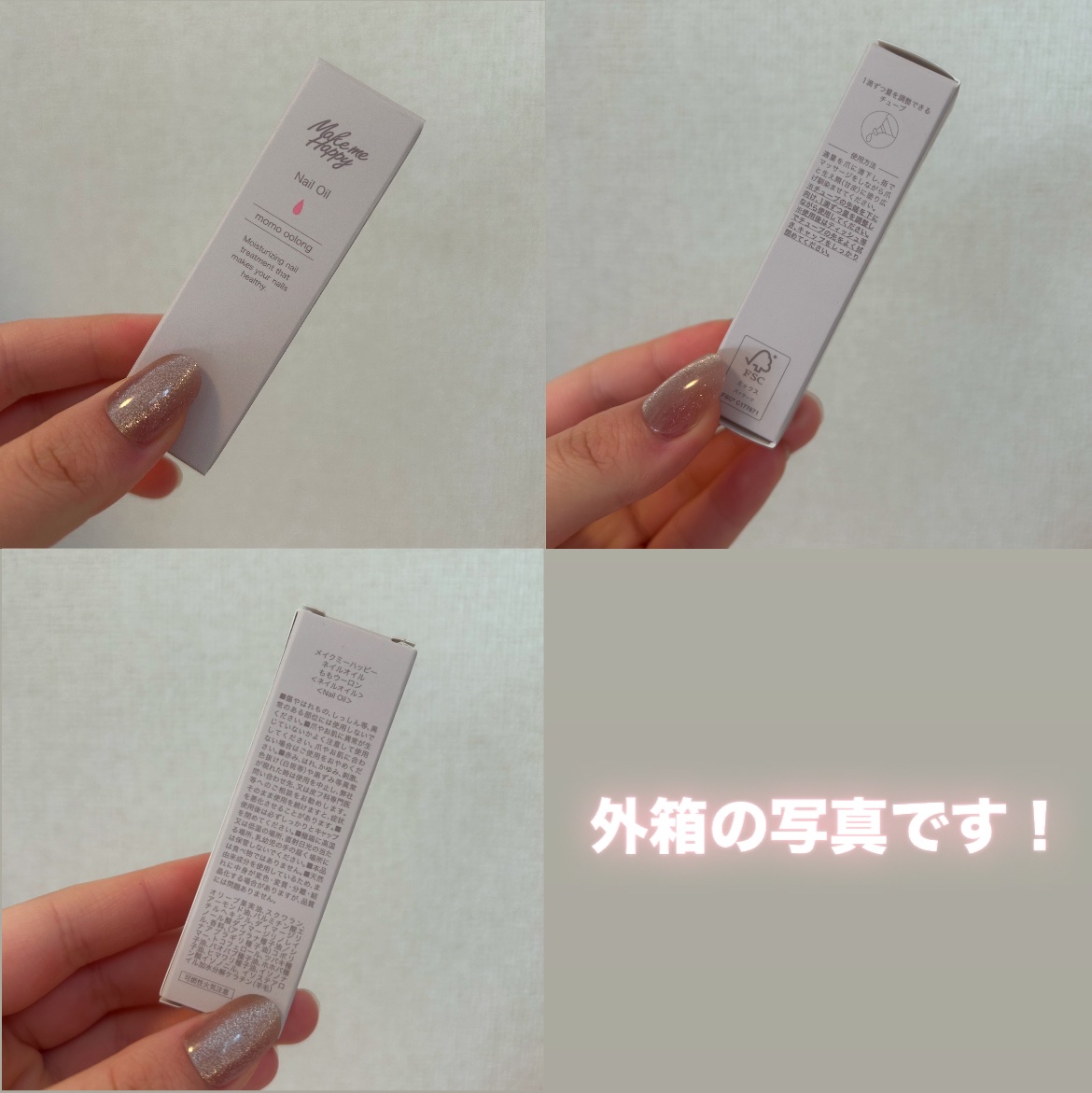 - 2023年12月下旬限定発売→2024年4月下旬以降順次定番化 爪・甘皮を保湿するフレグランスネイルオイル 滴下チューブのネイルオイルで1滴ずつ塗る量の調整ができます。 どこでも気軽に塗れるポケットサイズです。 高保湿はオイルが爪・甘皮にうるおい・ツヤを与え、乾燥を防ぎます。 べたつきにくいサラッとしたテクスチャーです。 トリートメント成分として、6種の植物オイル(ホホバ種子油、バオバブ種子油、アーモンド油、オリーブ果実油、ツバキ種子油、ヒマワリ種子油)を配合。 爪を健やかに保つ成分として、ケラチン(イソステアロイル加水分解ケラチン(羊毛))を配合。 白桃烏龍茶の香り TOP:ピーチ・レモン・ライチ MIDDLE:烏龍茶・ローズ・ゼラニウム・ジャスミン LAST:ムスク
