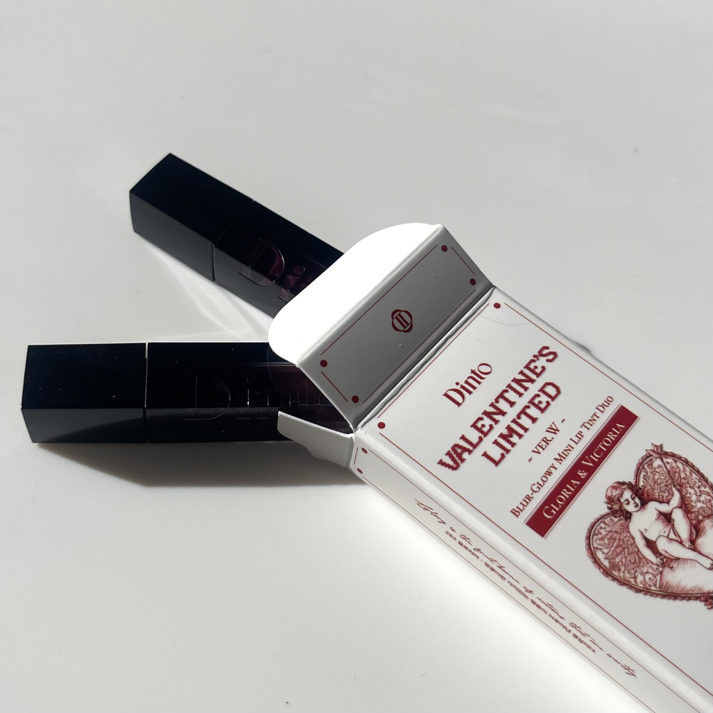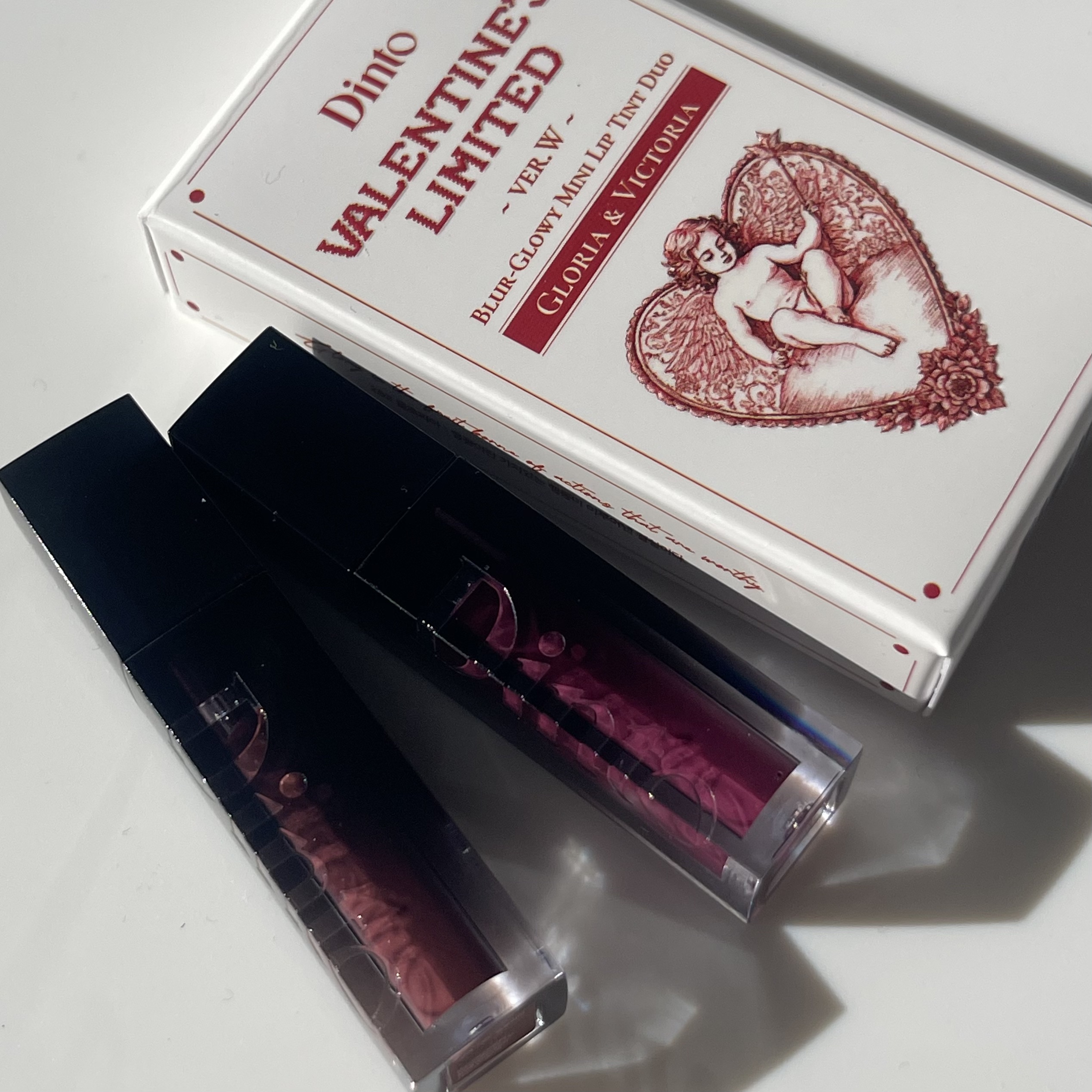 パッケージかわいい&みんな大好きミニサイズ「VALENTINE'S LIMITED Blur-Glowy Mini Lip Tint Duo」です✨ クランベリー果汁が染み込んだ チェリーブルーネット ミルクチョコレートカラー。 ジューシーな付け心地が、Dintoだなあって思いました♥️ しっかり色づいて、でも見た目にはわからないプルっと感が良きなんです。