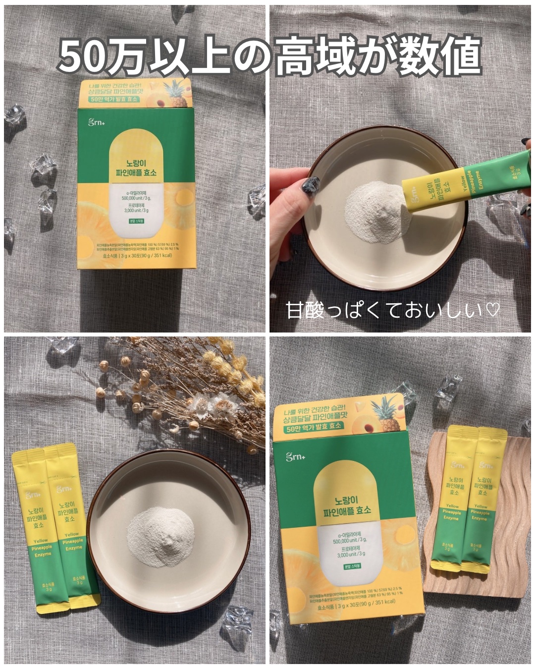一包当たり60万力価の発酵酵素で、人工的な精製酵素ではなく100%自然発酵酵素です!! これは、きな粉味で香ばしくて美味しかったよ🙆♀️ 黄色い箱のものはパイナップル味🍍 ハサミなしでも袋を開けれるから便利で手軽にどこでも飲めることができるよ!