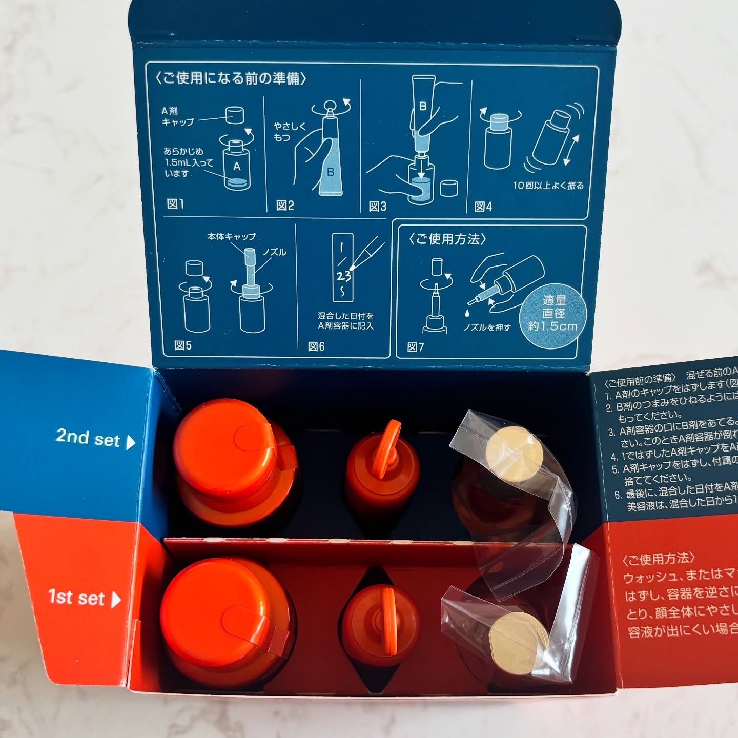- A剤<ガラスびん>1.5mL×2、B剤<チューブ>13.5mL×2、ノズル・本体キャップ×2: 19,800円