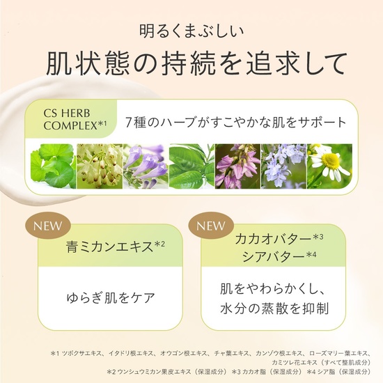 - ○KEY INGREDIENTS:ビタミンC誘導体*3、ナイアシンアミド、エクトイン、パンテノール、CS HERB COMPLEX*4 ○効果:トーンアップ*5、毛穴の引き締め、ハリ、保湿、トラブル鎮静 ○香り:ローズ*1、ジャスミン*2 POINT 1.肌のハリ密度を追求し、立体的な透明感*5へ 植物性のペプチドを新配合し、肌にいきいきとしたハリを与え、光を乱反射するなめらかな肌へと導きます。また、うるおいバリアをサポートするエクトインやパンテノールもプラス。リポソーム化したクリームが肌へとなじんでいく過程で、ふっくらとしたハリを叶えます。 ハリケアを叶える3種の成分 ・NEW 植物性ペプチド(カラスムギペプチド、ダイズペプチド):肌のコラーゲン生成メカニズムに着目したペプチド。肌にハリを与えます。 ・NEW エクトイン:肌に水分を与え、紫外線や乾燥などの外的環境から守るうるおいバリアをサポートします。 ・NEW パンテノール:肌荒れを防ぎながら、肌の水分蒸発を抑制し、うるおいバリアをサポートします。 POINT 2.多角的なケアでクリアな輝きをサポート ビタミンCを安定化して届けるビタミンC誘導体*3と3つのツヤ成分に加え、輝きをサポートするナイアシンアミド、みずみずしい肌をサポートするMade Snowなど、多角的に冴え渡る透明感*5へと導く保湿成分を新配合しました。 透明感を追求する成分 ・ビタミンC誘導体:ビタミンCを安定化して肌に届ける、「ルミエールライン」の主役となる成分 ・NEW ナイアシンアミド:ビタミンB3。美容のオールラウンダーで、キメの整った透明感*5を与えます。 ・NEW 麦芽エキス:発芽した大麦粒から抽出された天然の保湿成分。美しいスキントーンをサポート。 ・3つのツヤ成分(サフラワー油、ビサボロール、トコフェロール):人の皮脂と近い構造のため肌になじみがよく、肌に必要な成分。 POINT 3.明るくまぶしい肌の持続を追求 肌をやわらかく整えながらうるおいの蒸発を防ぐカカオバター、シアバターを配合。また、CS HERB COMPLEX*4や青ミカンエキス*6が、透明感*5を遮ってしまうかさつきや肌荒れを未然にガード。肌のまぶしいうるおいを長時間保ちます。 *1ローズ油 *2マツリカ花エキス *3アスコルビルグルコシド *4ツボクサエキス、イタドリ根エキス、オウゴン根エキス、チャ葉エキス、カンゾウ根エキス、ローズマリー葉エキス、カミツレ花エキス *5うるおいを与えて透明感をもたらす *6ウンシュウミカン果皮エキス