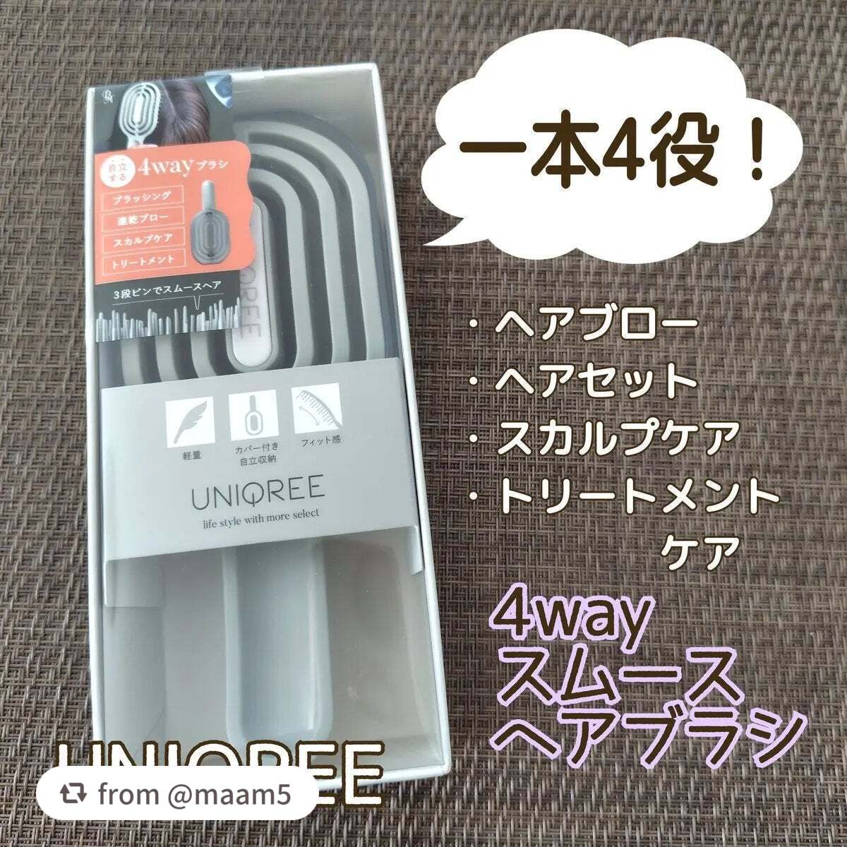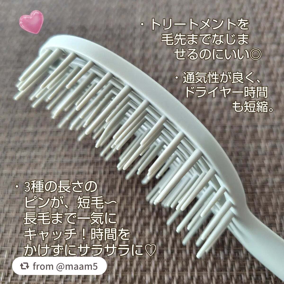 - #バズリブラシのいいとこどり #立つヘアブラシ #まるっと洗えるヘアブラシ ✨コレ1本でヘアケア悩みを解消✨ ①ブラッシング&スタイリング ②ドライ&ブロー ③スカルプケア ④トリートメントコーム 💡おすすめPoint💡 1)特徴的なピン ⇒長さの異なる3本のピンが短い毛~長い毛までしっかりキャッチ ⇒タテ・ヨコ・ナナメ満遍なくとかせて、簡単にやさしくサラサラに ⇒しなやかなピンで、濡髪も細い毛も負担が少なくダメージ減 ⇒円錐形のピンで、トリートメントがピンに付着しづらく、髪に馴染む 2)ブラシ構造 ⇒クモの巣みたいな通気性の良い構造で、速乾だから熱ダメージ減 ⇒水はけも良いので、お風呂でも使いやすい ⇒頭の丸みにあわせてカーブ状だから、頭皮にフィットして気持ちいい ⇒やわらか素材なので、スカルプケアも頭皮にぴったり 3)軽量+コンパクト ⇒「立つヘアブラシ」ケースを付ければ、自立するから、すき間収納OK! ⇒軽量&コンパクトでケース付き、旅行も携帯もラクラク 4)まるっと洗えて清潔 ⇒スタイリング剤・汗でベタベタ髪も大丈夫! ⇒海やプールでも使っても洗える