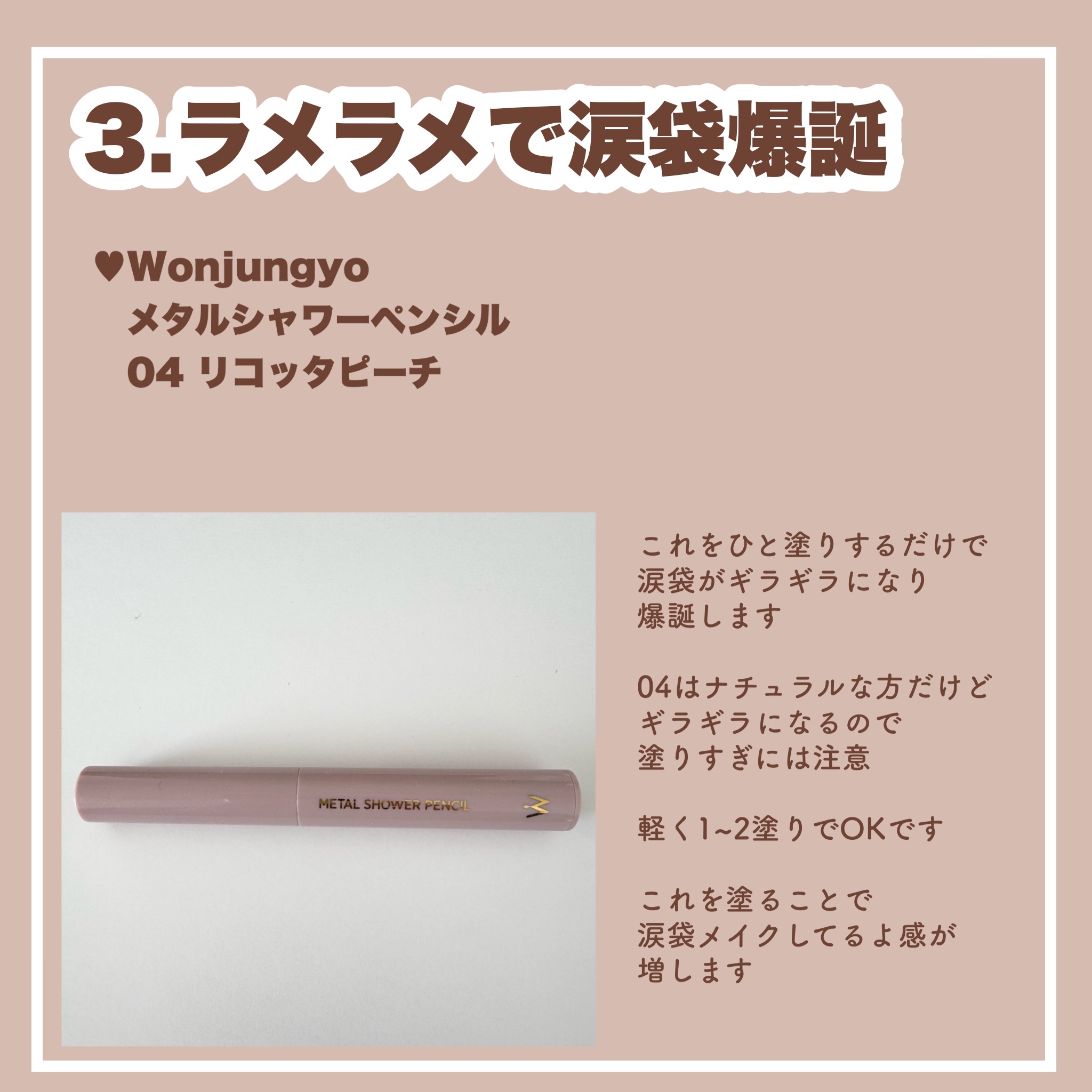 ナチュラルにぷくっと柔らかい印象にもなるカラーが可愛い💕 私は04リコッタピーチというカラーが特に自然な涙袋が描けると思いました✨ イエベさん向きと思いましたが、イエローに振り切っていないからブルベさんも使いやすいと思います☺️