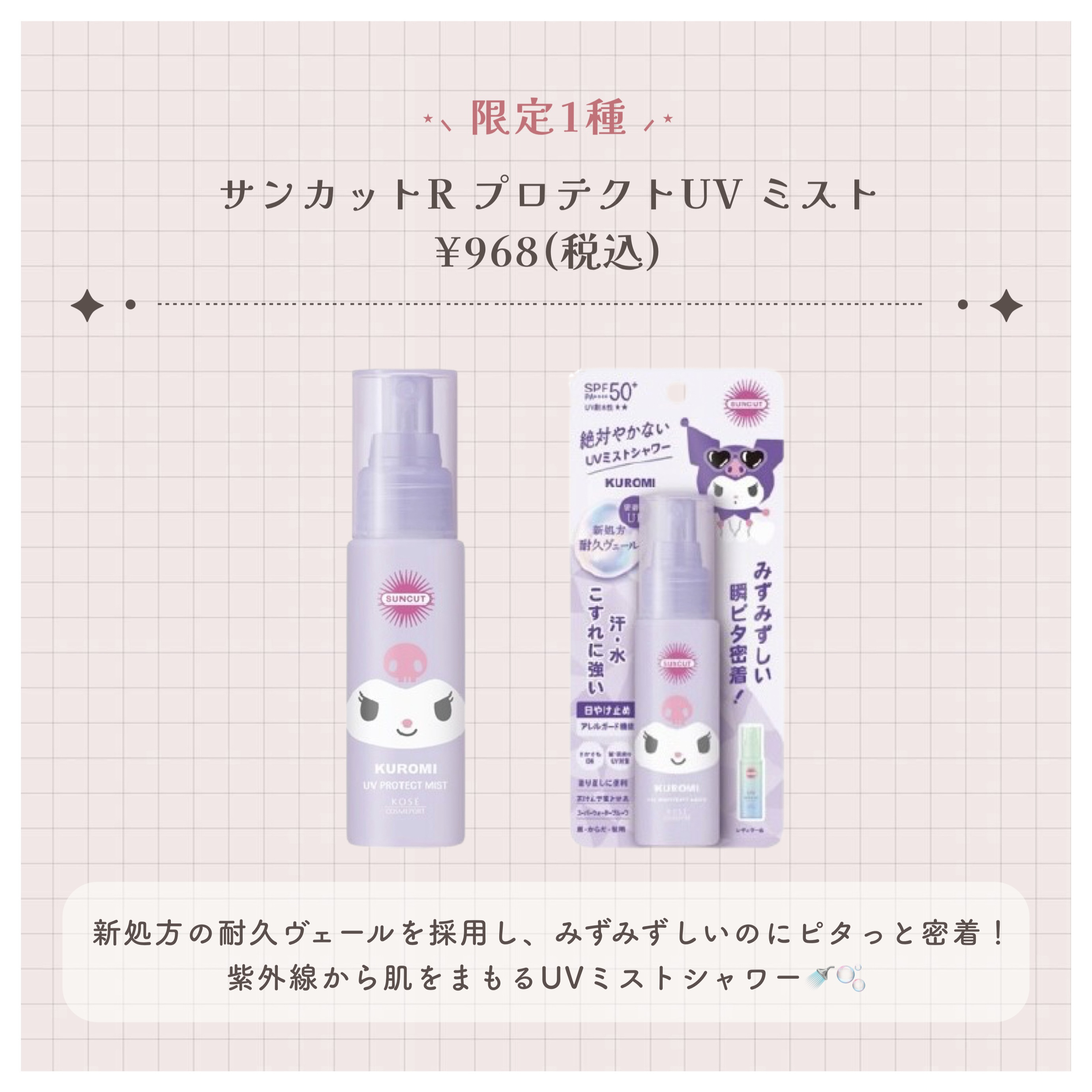 プロテクトUV スプレー ハローキティ”の限定デザインで登場 さらさら軽やかな使用感でありながら肌にしっかり密着し紫外線ダメージから肌をまもります。 パーフェクトUV スプレー ポムポムプリン"の限定デザインで登場 海などのレジャーシーンでもお使いいただける耐久性に優れた日やけ止めスプレーです パーフェクトUV ジェル シナモロール”の限定デザインで登場 みずみずしい軽い使用感が特長で汗・水・こすれにも強い持続型UVジェル