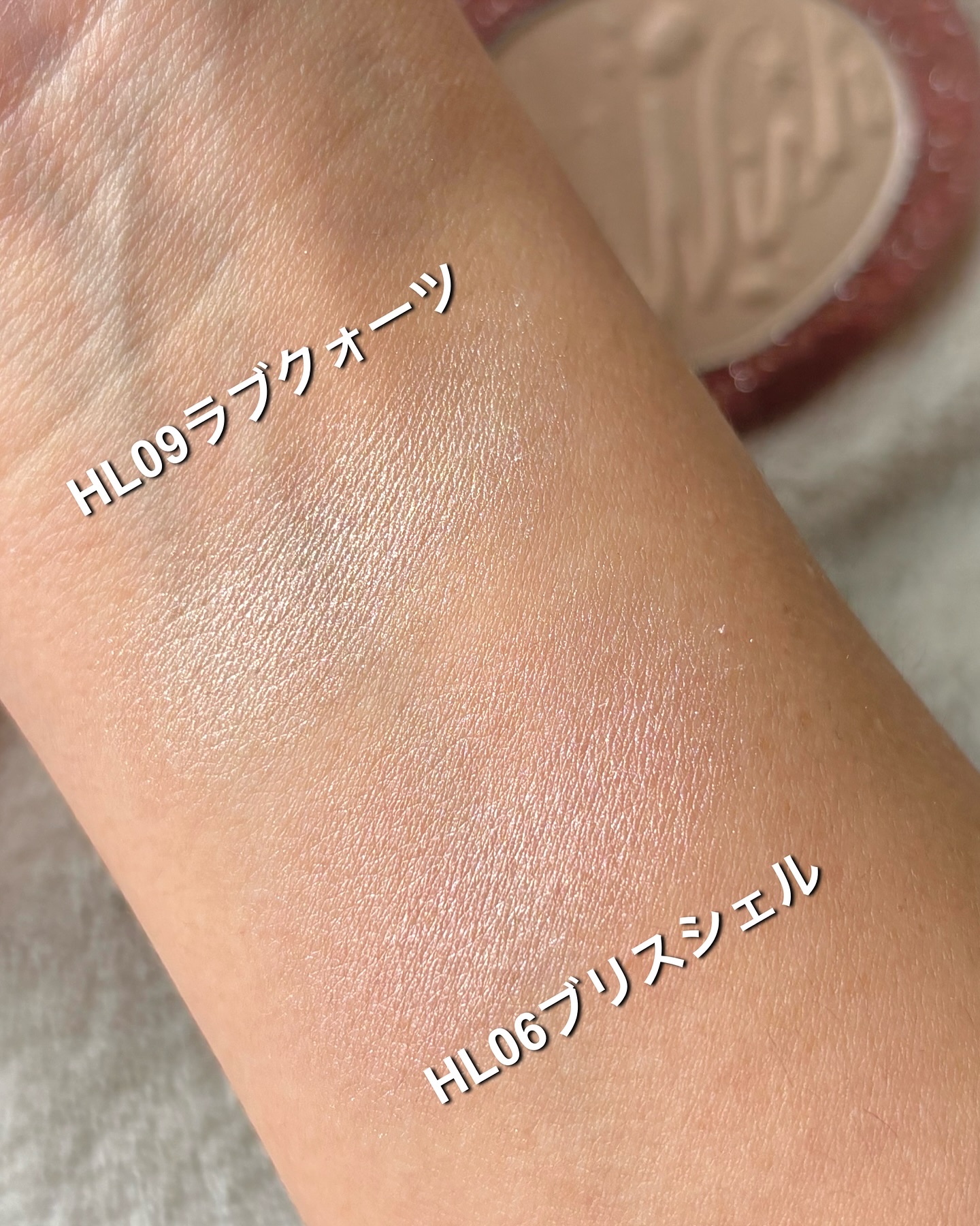 今までのハイライトよりピンクぽいカラー! ロゼベージュは少し濃い感じでしたが、こちらは白っぽいので、濃くかんじません! オーロラミントは白っぽい感じで、肌につけると、結構色白に見えるかんじでしたが、今回のはピンクがかっているので、肌の血色がよく見える💓 もちろん、今まで通りしっとりしているので、密着も良い✨