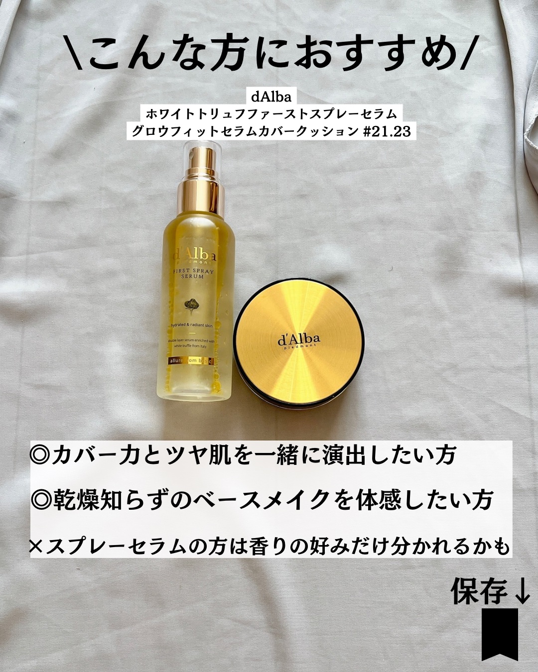 ツヤ感&カバー力良き🙆♀️ 前から大好きだったスプレーセラムと組み合わせて使うことでツヤ感が更にupして韓国美女みたいな肌になれるわ🫶 ダルバのファンデ良すぎ✨💖 セラムはメイク前後とパフにシュッとしてね♥