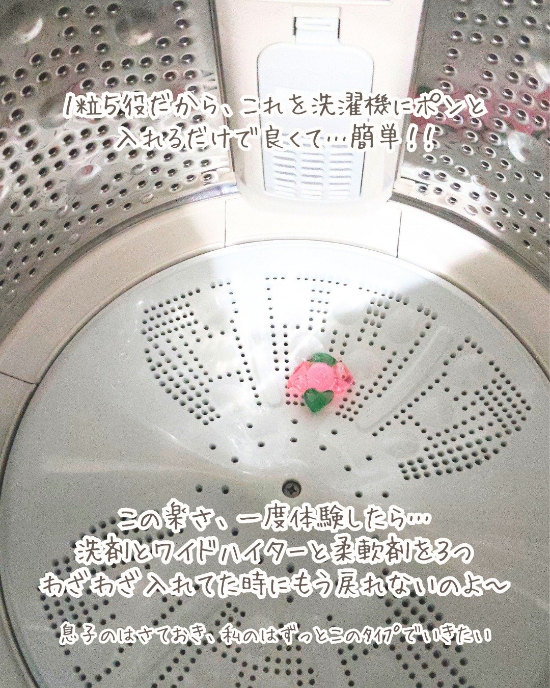 洗剤とは思えないほどの可愛さと香りで、寝室に飾りたくなっちゃう🩷 今回、ローズを使わせていただいてますが、スウィートなローズ&ピーチ🍑がほどよくあまくて上品な香りがほんわり優しく漂い癒されます🥰 洗浄、柔軟、香り付け、抗菌、色落ち防止の5つの効果を1粒に閉じ込めた5in1✨なのです♡