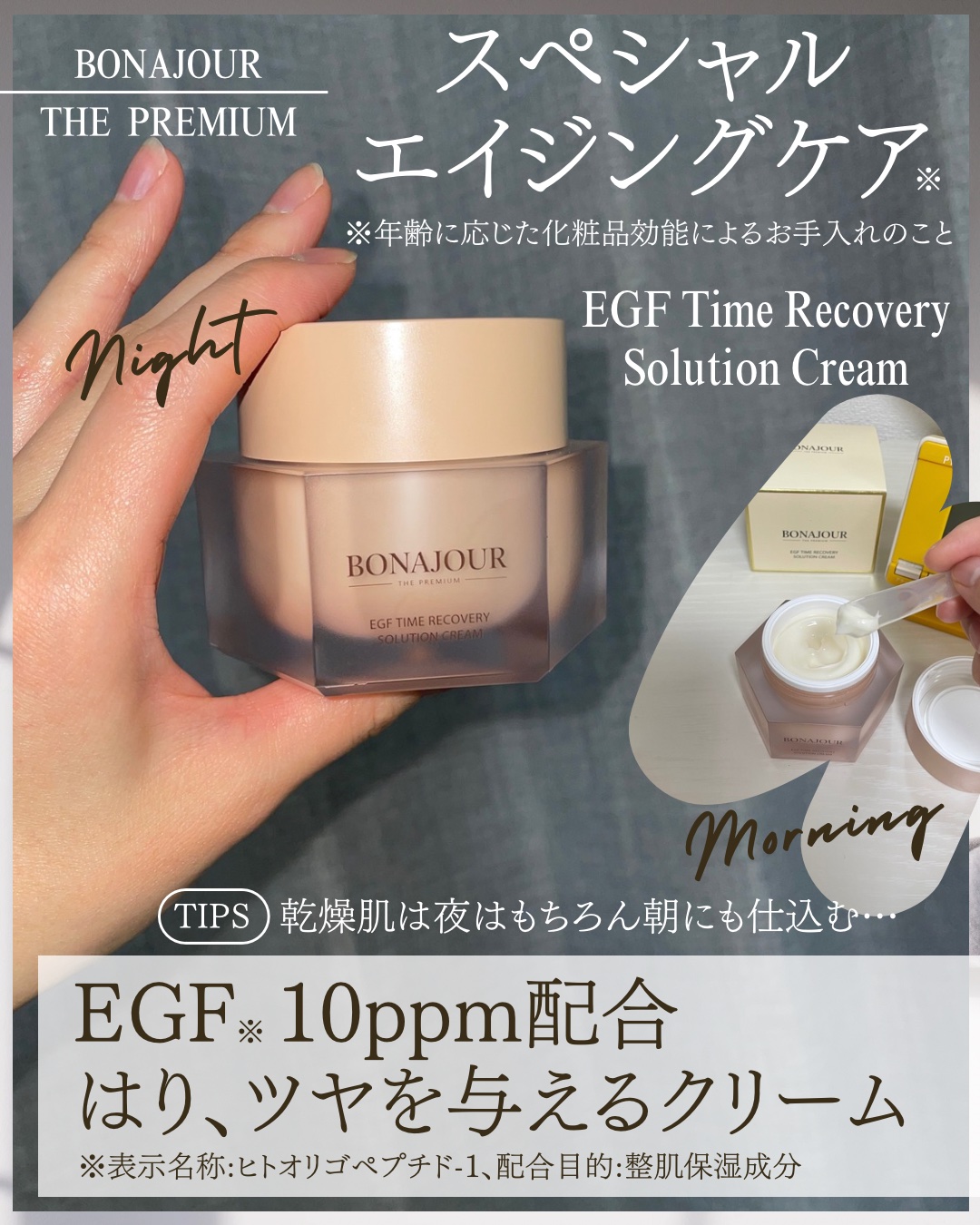 もちっとした濃密テクスチャのクリームで、優しく包み込んでくれるようなリッチな使用感🤍 EGFクリームだけの特別なハイクオリティ成分レシピ💎 翌朝ベタつきがちなのに、これはむしろ程よくしっとりキープで超良い🥹✨