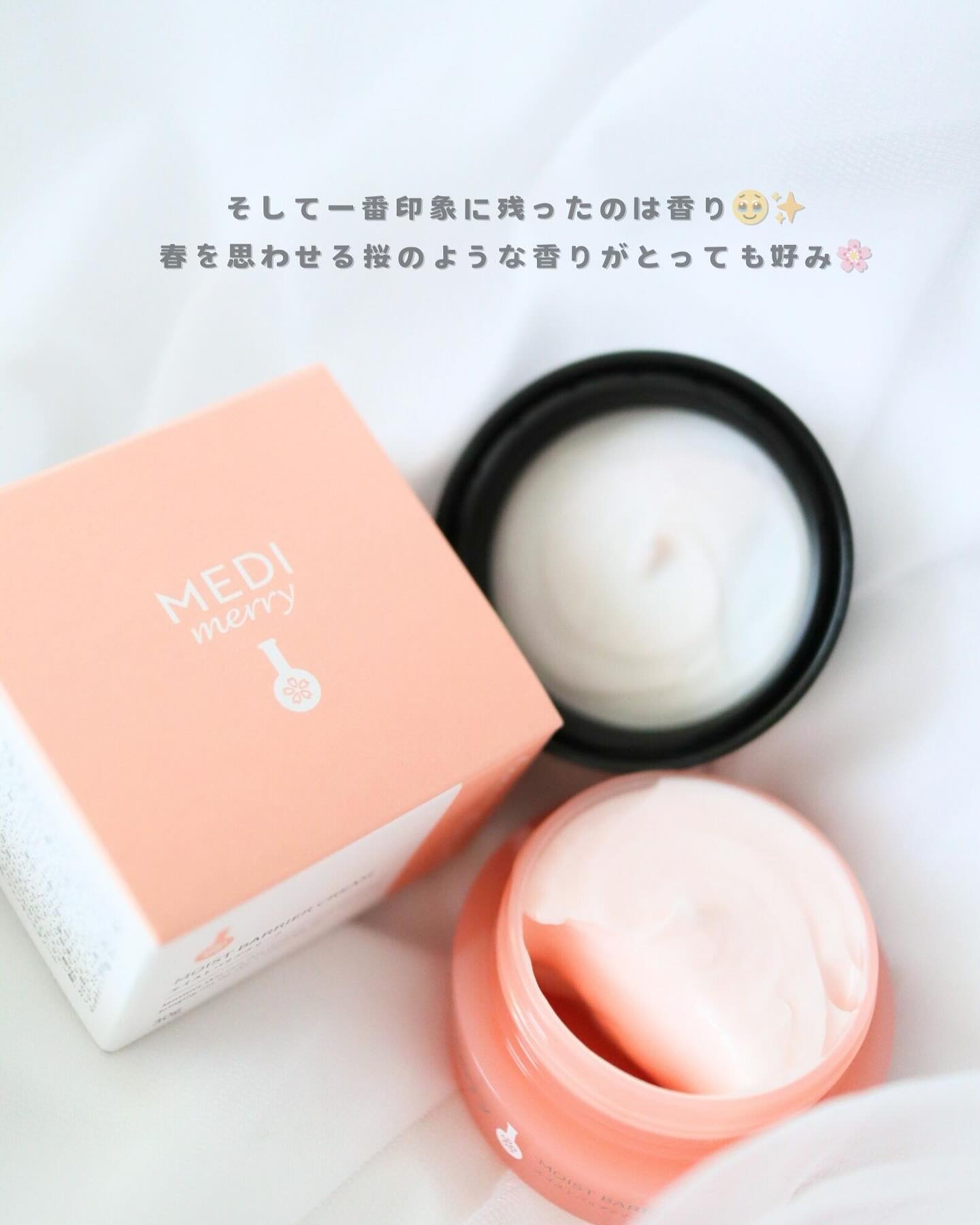 桜ハーブの香りがほのかにして、ふんわりとした気持ちになり心が安らぎました。 メディメリーは和漢と科学の融合で各方面から肌悩みにアプローチし、肌本来の美しさへ導くことを目指したシリーズだそうです。 桜の花びらを思わせるような優し気なピンク色のクリームです。クリームはとろっとしていてかつ、弾力があり肌にのせると溶けるような質感でした。