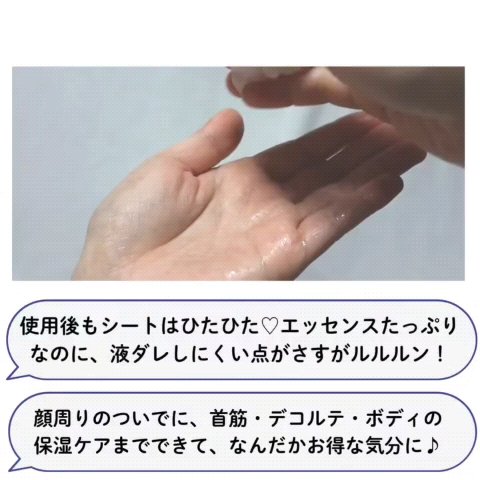 | やわらかい感触のシート♪ たっぷりの化粧水が含まれているのが分かるくらい うるうるしています😊 | 詳細を見る | |