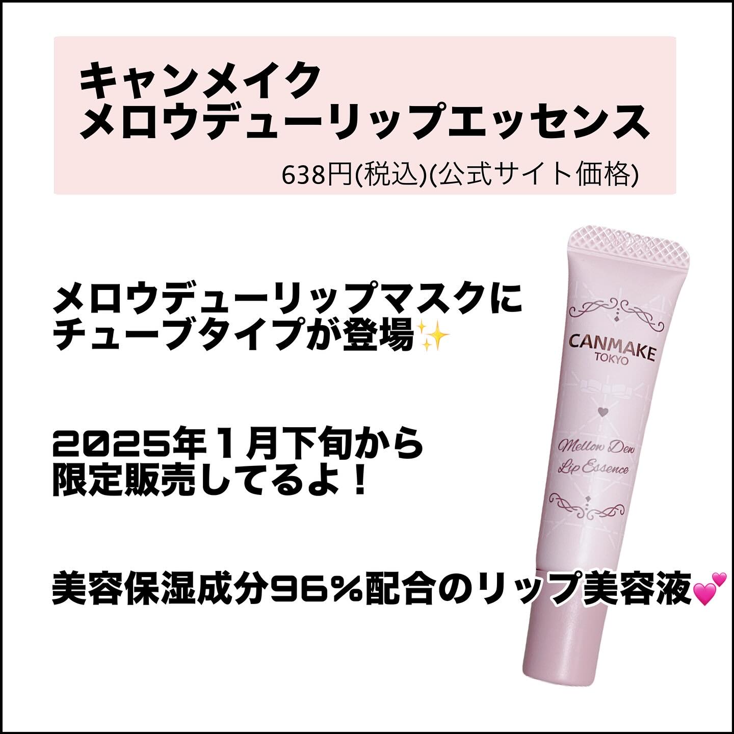 - 2025年7月以降順次定番化! いつでも保湿ケア♡ぷるぷる唇 リップ美容液! メロウデューリップマスクから登場した、いつでも保湿ケアができるチューブタイプのリップ美容液です。 乾燥によるカサつきくすみが気になる唇に!美容液成分96%配合。 【しっとりぷるぷる♪集中保湿ケア】 ・長時間しっとりキープし、うるおい持続。 ・水分蒸散を防ぎ、乾燥から守る。 【べたつきにくい】 【唇の縦ジワ補正※】 ・唇の縦ジワを補正し、ふっくらとハリのある唇に。 ※メイクアップ効果 【ぷっくりグロス効果&ナイトケア】 ツヤ感をプラスして、リップグロスとして使える♪ たっぷり塗ればナイトケアにも! 【唇の荒れを防ぐ】 ★美容保湿成分配合★ グリチルレチン酸ステアリル、セラミドNP、トコフェロール、ピリドキシンHCl、パンテノール 【細めの斜めカットチューブ】 唇にフィットし、はみ出さずに塗りやすい。持ち運びしやすく、日中のお出かけにも♡