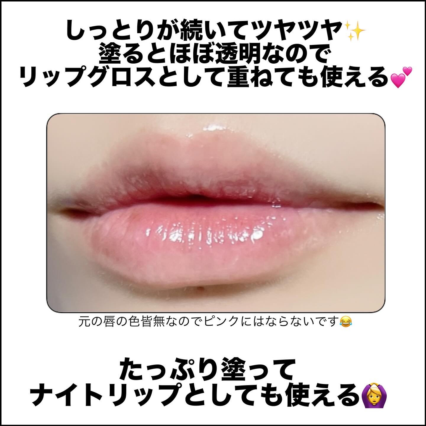 しっとりシアーな発色のツヤリップ❤︎ 保湿力も高く色持ちも良い◎ タフィーベリーはナチュラルなピンクでデイリー使いにピッタリ❤︎ どちらかと言うとブルベ向けの色味! 塗り心地は滑らかでとろける感じ◎ シアーだけど発色も良くて、保湿力が高いので塗り直しても私は皮剥けしなかったです😊