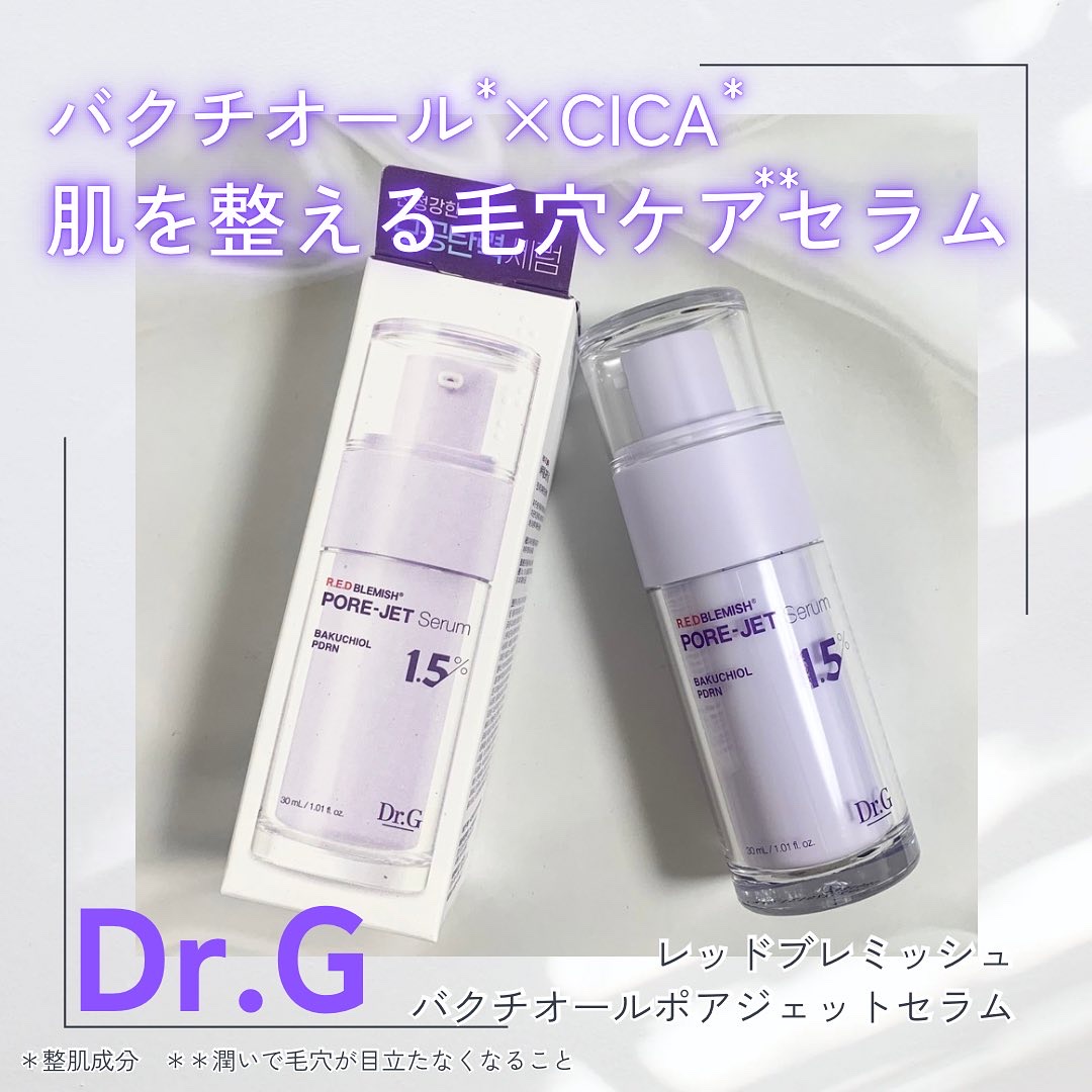 バクチオール配合アイテム✨️ Dr.Gの人気アイテムレッドブレミッシュスージングクリームと同じシリーズから登場した レチノールより刺激が少ないんだとか。肌の弾力・キメ、毛穴が気になる人におすすめなんだって♪ セラムはみずみずしいんだけど、塗り広げるとピタッとお肌に密着するような保湿感。