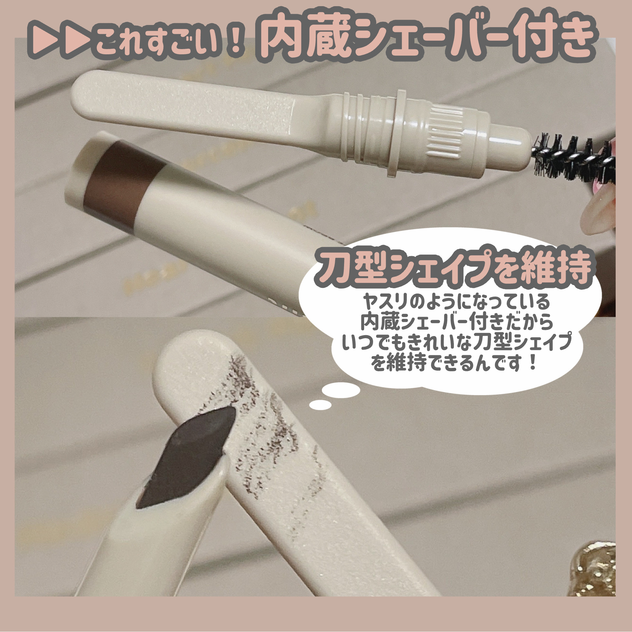 - 全6色のカラーバリエーションで濃すぎず、薄すぎない発色で、ナチュラルな眉毛を演出することができます。短刀型シェイプにより、一本一本植えるように線で表現でき、また細やかに面で表現することもできます。特に内蔵アプリケーターシェーバーで、手軽に短刀型シェイプが維持できます。