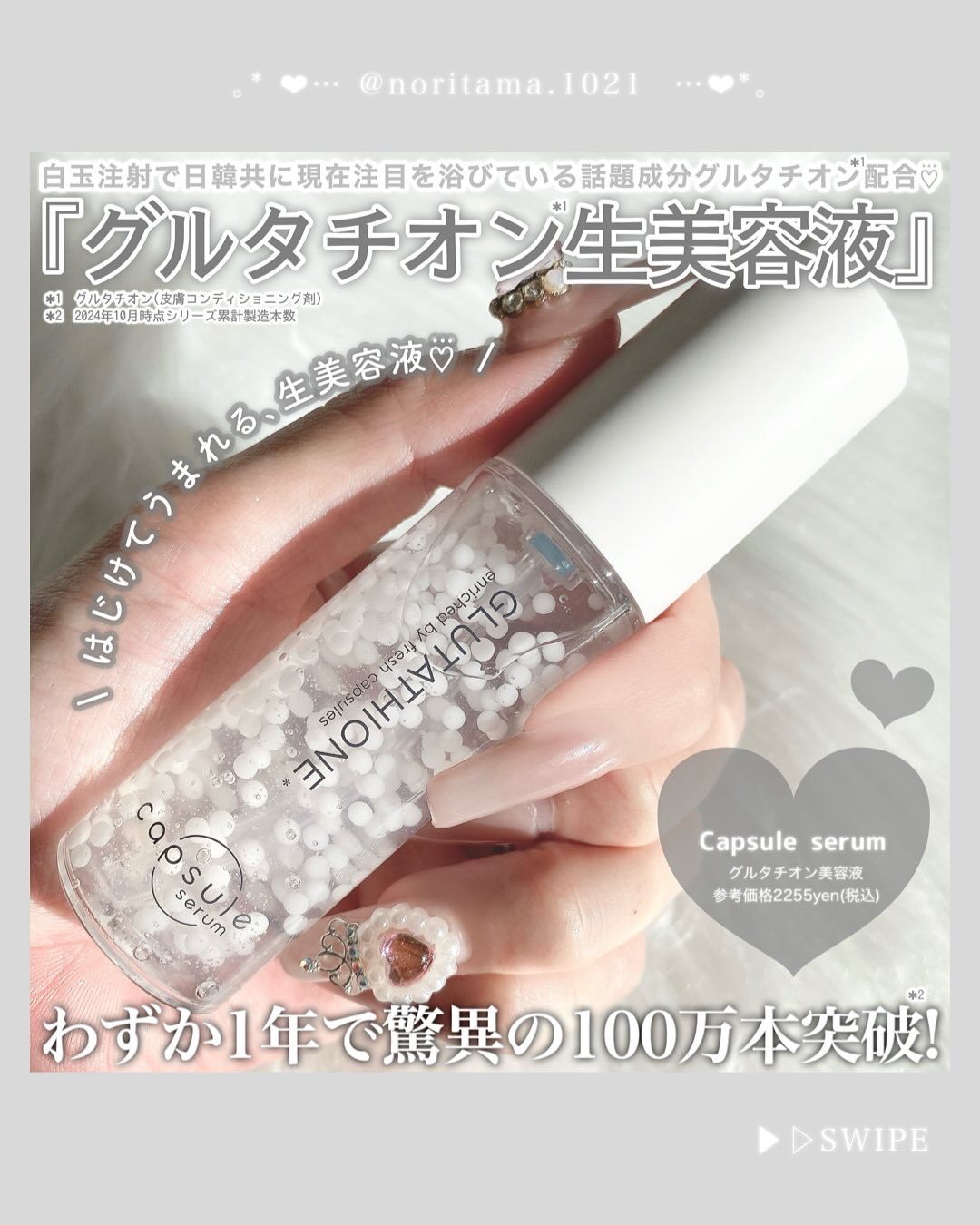 - ①はじける白玉!注目の"グルタチオン"*1をカプセルに厳選配合 ②新鮮なグルタチオンが肌に浸透*2 ③グルタチオン×2種のビタミンC誘導体*3が総合的にアプローチ ④コラーゲン、ヒアルロン酸、3種類のセラミド、ナイアシンアミド、ツボクサエキス(CICA)、フラーレン等11種類の整肌成分を同時に配合 ⑤肌なじみのよい使い心地 ⑤毛穴*4、ざらつき*5、くすみ*5・透明感5、キメ・ツヤもコレ1つで。4in1美容液。 はじけて生まれる生美容液。-独自カプセルが、成分本来のチカラをサポートするこだわりの美容液- *1グルタチオン(皮膚コンディショニング剤) *2角質層まで *3パルミチン酸アスコルビルリン酸3Na、3-グリセリルアスコルビン酸(酸化防止剤) *4乾燥による毛穴の開き *5乾燥による