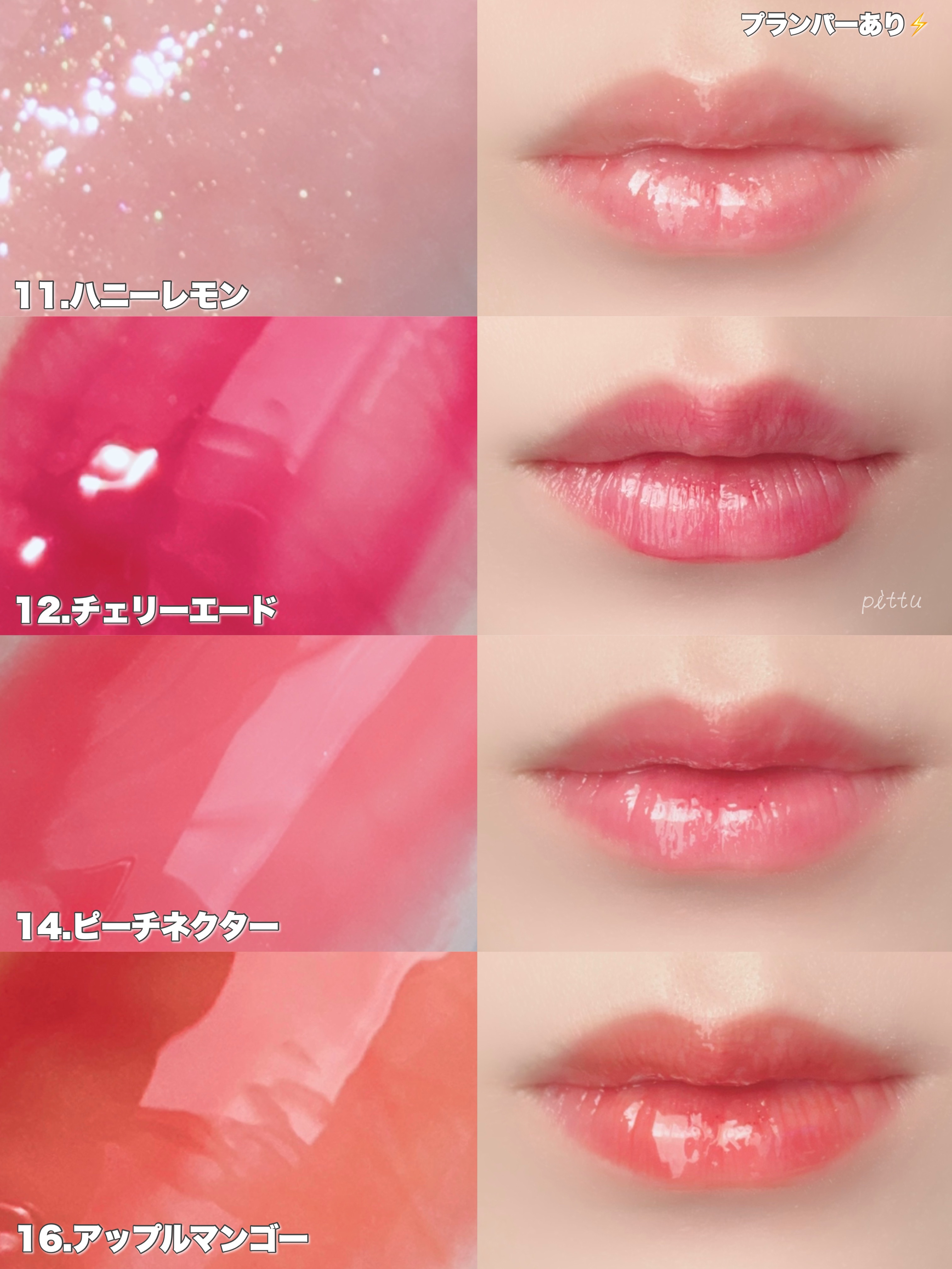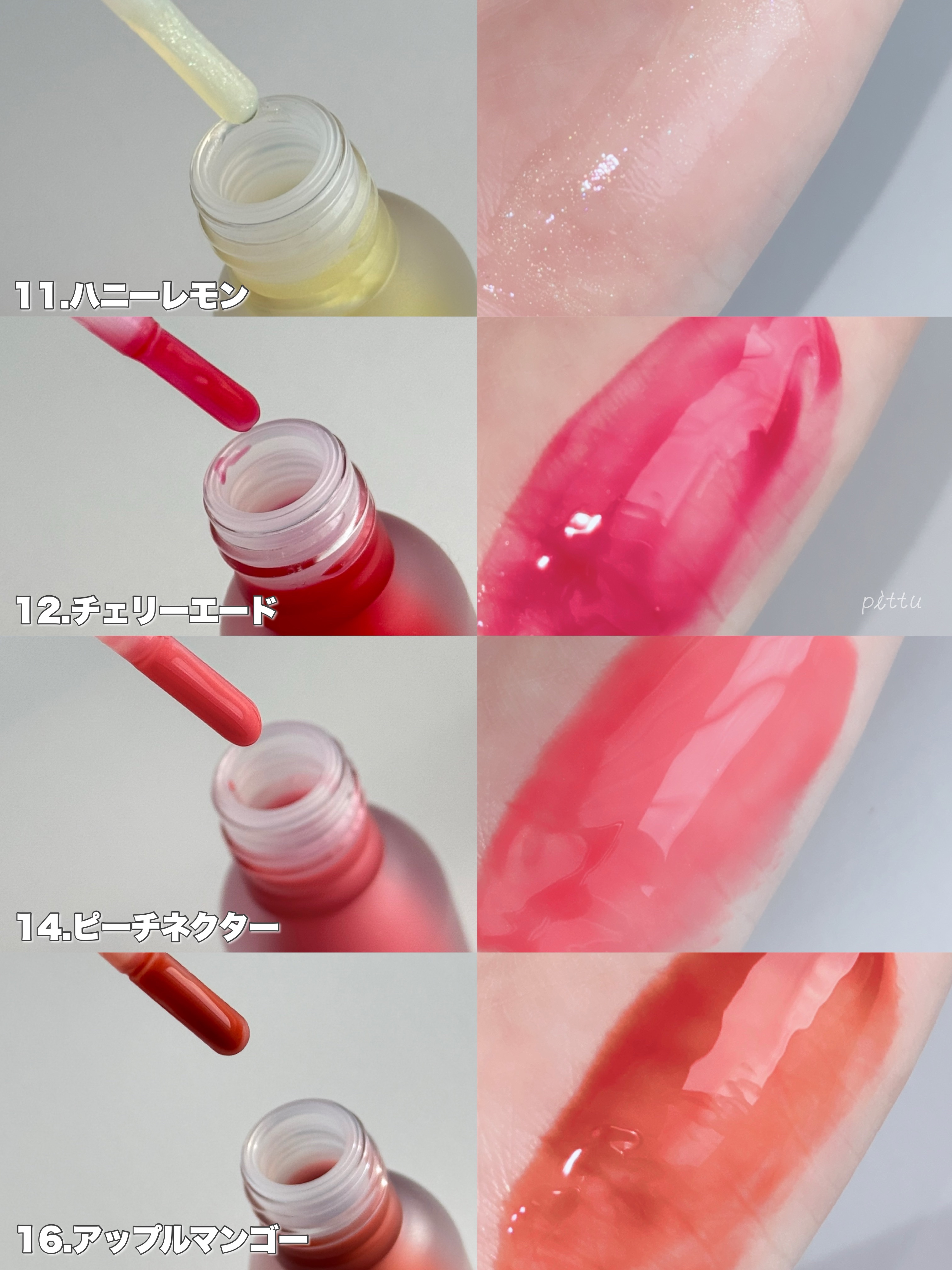 プランピング効果は1〜2段階 ビー玉のように輝く光沢感✨ 自然由来の高保湿オイルベース! ✔︎11ハニーレモン 爽やかにはじけるレモンイエロー🍋 ほんのりイエローカラーに細かいラメが入っている✨ ✔︎14ピーチネクター イエベ・ブルベ両方とも好まれる桃カラー🍑 3月発売予定の日本限定カラー✨