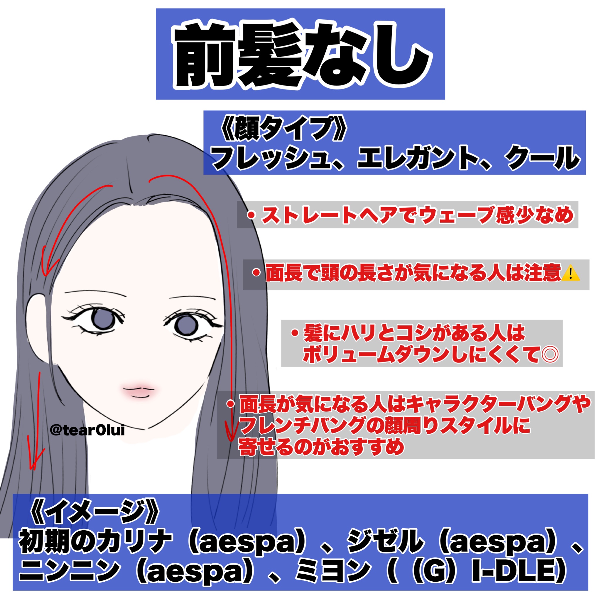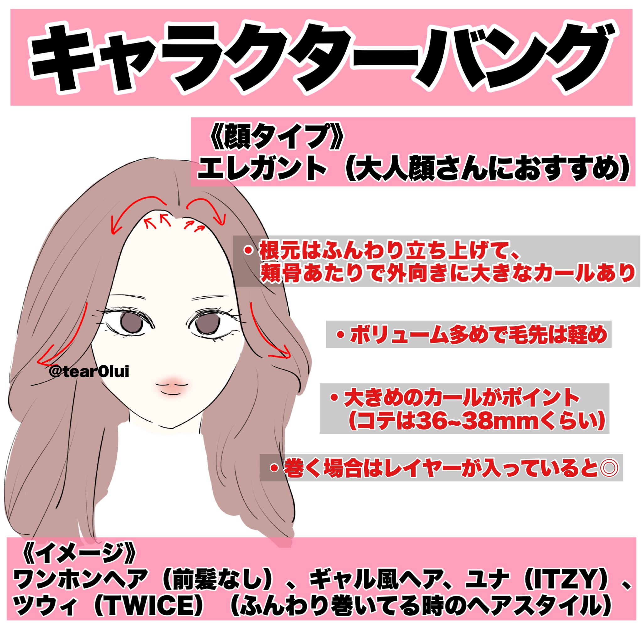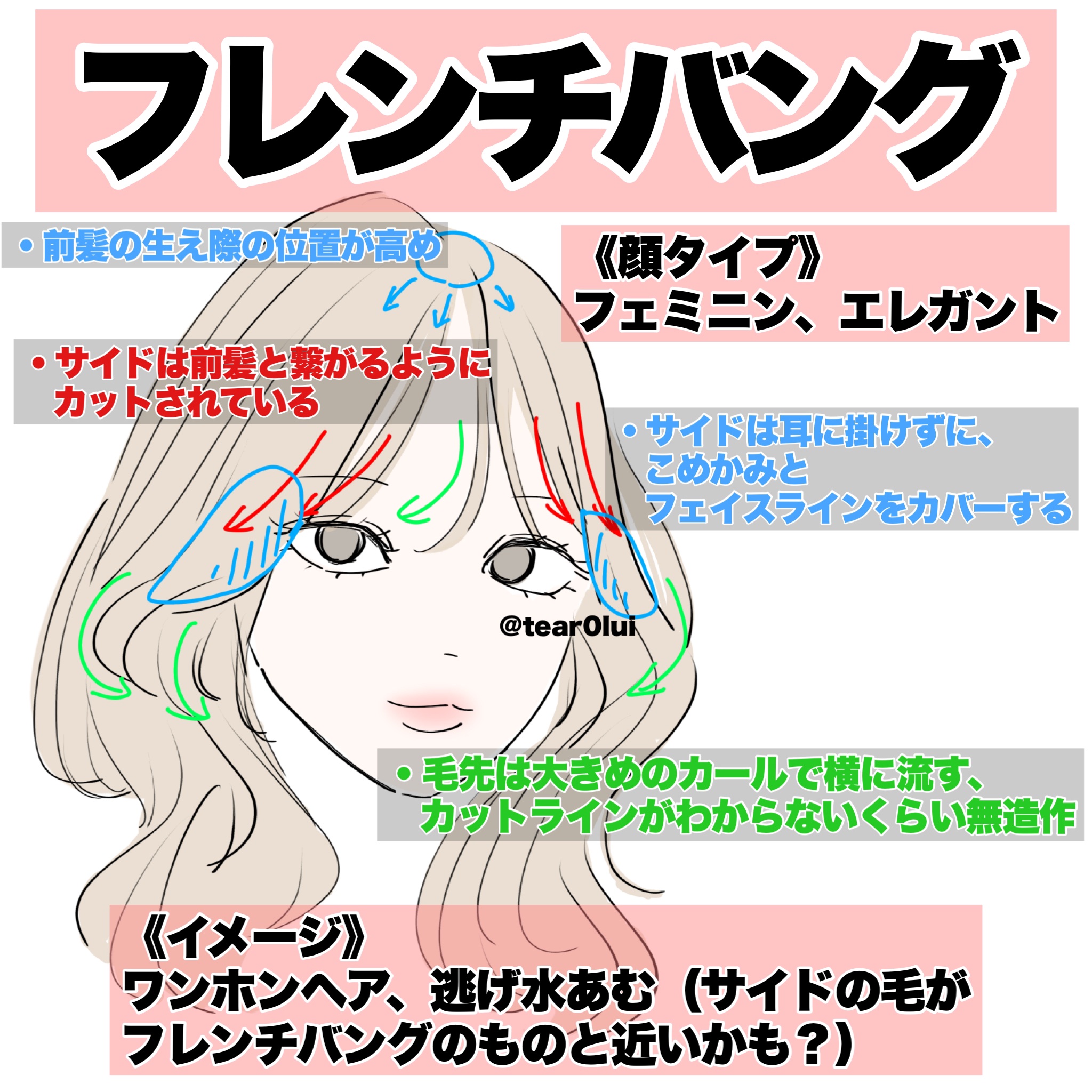 外側の輪郭は毛先だけ内側へ この毛の1番外側(上)の毛を少し取ってアイロンでふわっと動きを出すとフレンチバングらしい抜け感が出せると思います! 後れ毛は顎くらいの長さで緩い内巻き 1つ長い後れ毛を作って、それを顎くらいの長さにして全体的に緩い内巻きにしてあげるとふわふわしたかんじが出やすくなると思います。 前髪は全体的に長めで毛先だけワンカールで横に流す。かなり薄め! これを毛先だけワンカールにして横に流すと一気にフレンチバングっぽくなると思います👍🏻薄く作るのもポイントです❕