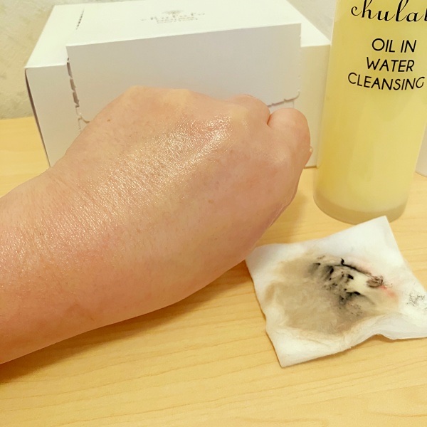 見た目にも綺麗な、振って使うオイル層とウォーター層の2層式ハイブリッドクレンジングです。 ウルトラファインナノバブル水が毛穴の汚れや角質をきれいに除去してくれるそうです。 優しくメイクを拭き取っていきます。 すっきり落ちるんだけど、しっとりとした使い心地で気に入りました。