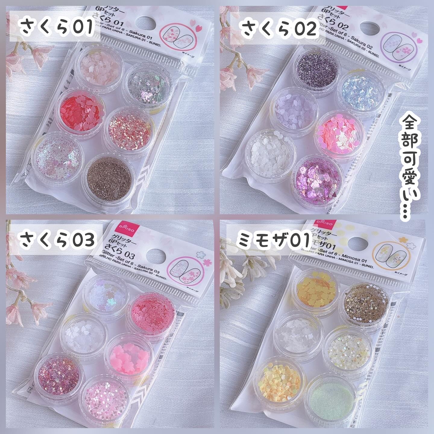 ダイソーから春にぴったりのグリッターセットが登場✨ さくら3種、ミモザ1種で各6種セット!これが100円は安すぎる😳 お花型以外のものは汎用性も高い👏 季節問わず使えますね! このグリッターを使ったネイルデザインも投稿したい…!