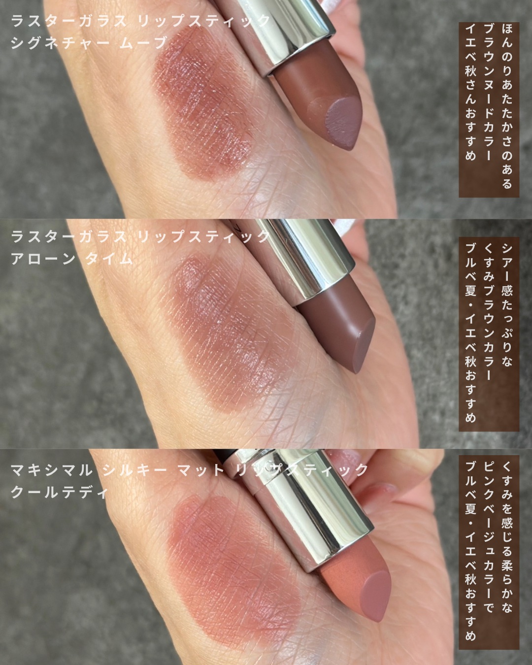 全てベージュベースになっている 肌馴染みの良いリップ。 シアーな仕上がりでリップトリートメント としても使えちゃうところも良い! スウォッチは何度もぐりぐりぬって この発色なのでそんなにパソカも気にしなくて良さそう❤️ SD04や、SD02は明るさもあるピンクなので 春の季節にもぴったりなイチオシカラー🌸 リップ自体も細くてスマートで 小さめバッグにも入れやすいよ👜