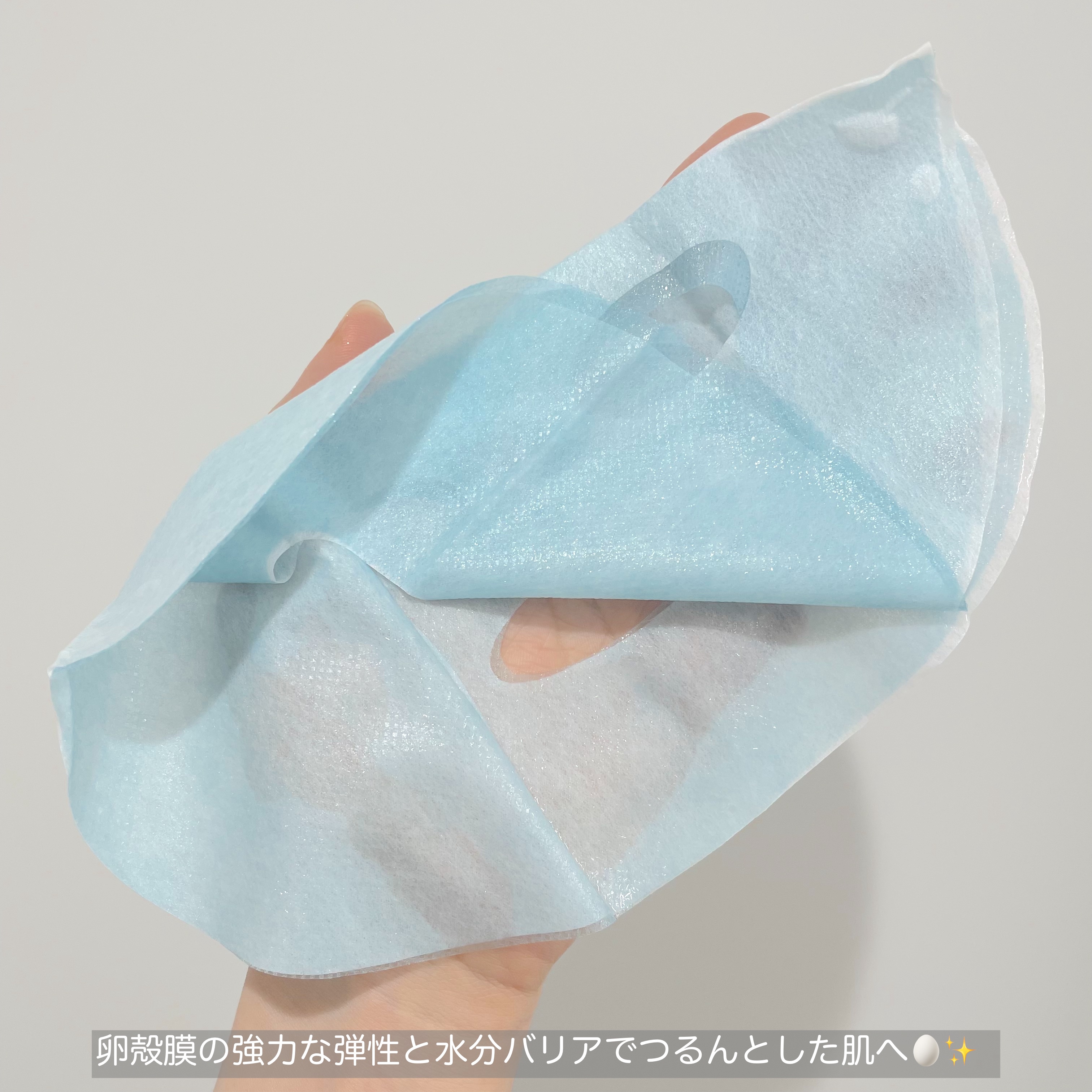 卵殻膜の強力な弾性と水分バリアでつるんとした肌へ 80%以上のコラーゲンを含有しており、1つあたり0.05gしかとれない弾力バリア成分 シートが薄くてピッタリと肌に密着する感じがあります。外側のブルーのシートを剥がして13分⌛ はがしてみるとつるんとピカピカなお肌✨ すごくハリが出たような感じ!