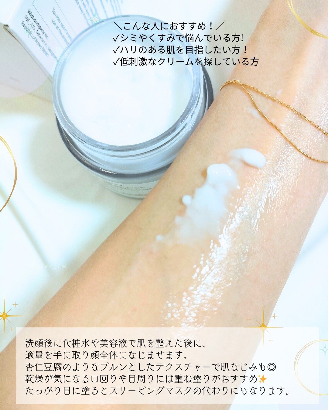 抗酸化に優れたビタミンE(抗酸化・美白)を豊富に含有♡ ナイアシンアミド(美白・しわ改善)、アデノシン(エイジングケア)も配合されてます。 白くて付属のスパチュラですくうと、プルンっとしてまるで杏仁豆腐✨ ペタペタするけどたっぷりめに塗ってスリーピングマスクとして使うのもオススメです♡