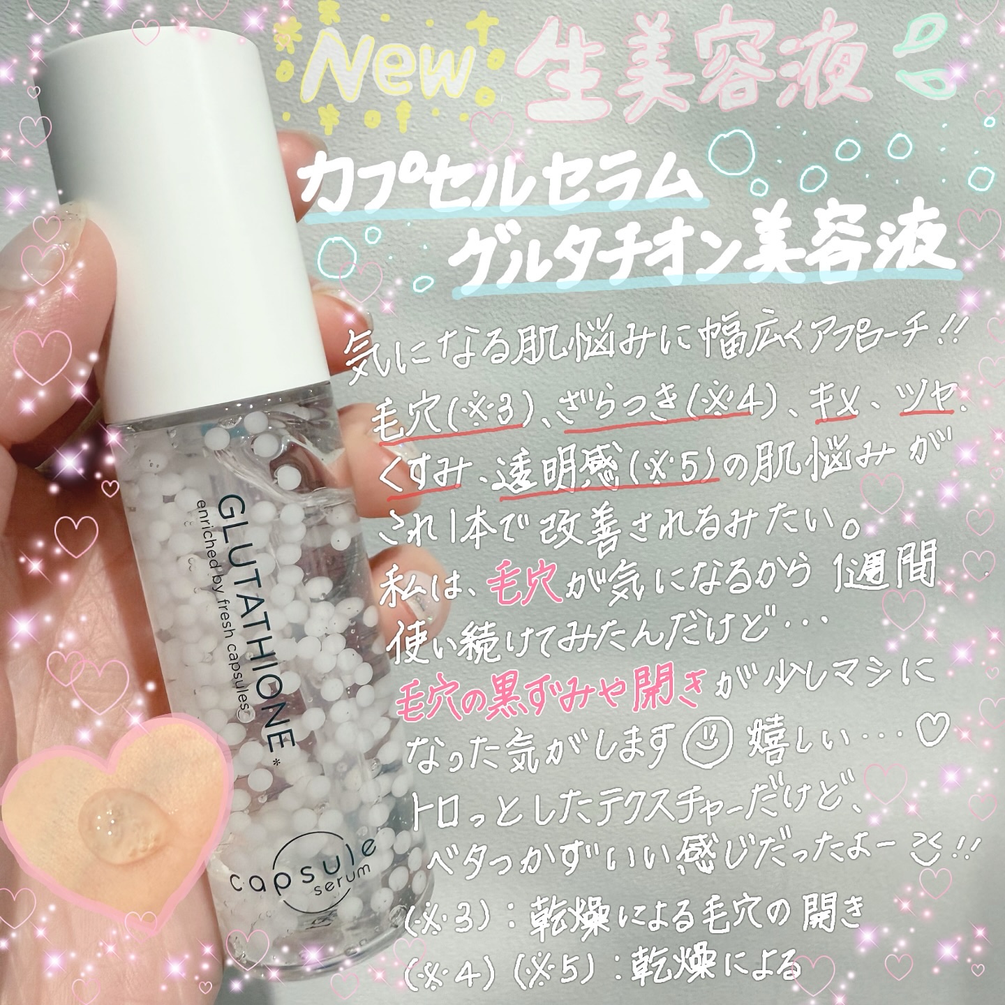 はじけてうまれる、生美容液 見た目にも分かるように、粒々のカプセルが入ってる!カプセルは柔らかくて、なじませるととろっとなじんでいく感じ。 くすみ•透明感におすすめのグルタチオン配合のものをチョイス💡 他にも毛穴悩みにおすすめのビタミンCや、ハリ•弾力不足におすすめのアスタキサンチン配合のものがあるよ✨ 仕上がりはしっとりして、保湿力も高く満足🤍 ぜひチェックしてみてください🌸