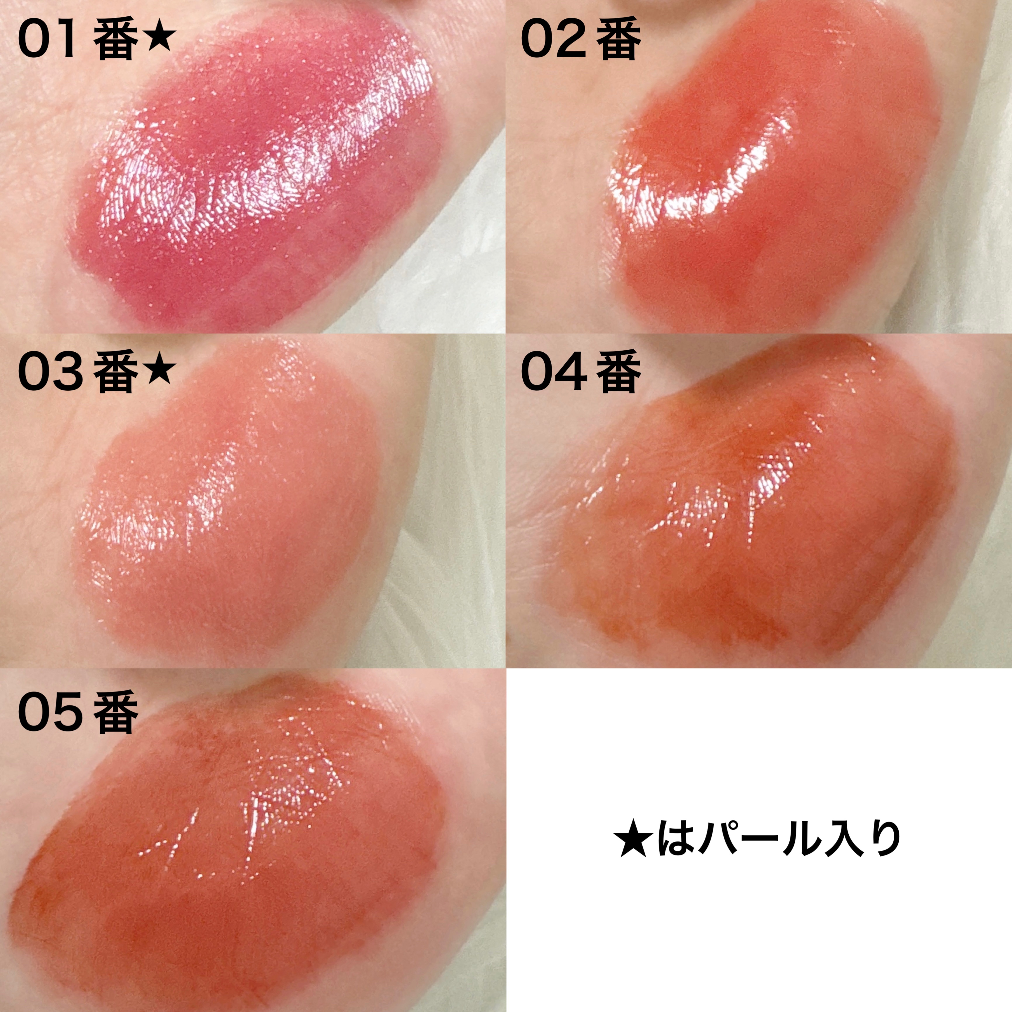 - <01 モーブローズ> リンゴ酸ジイソステアリル、水、ビスジグリセリルポリアシルアジペート-2、ジフェニルシロキシフェニルトリメチコン、トリメチルペンタフェニルトリシロキサン、ジグリセリン、水添ポリイソブテン、グリセリン、ペンチレングリコール、セチルPEG/PPG-10/1ジメチコン、イソステアリン酸ソルビタン、セテアレス-20、フェノキシエタノール、(アクリル酸ヒドロキシエチル/アクリロイルジメチルタウリンNa)コポリマー、スクワラン、クロレラエキス、グルコース、BG、香料、フルクトオリゴ糖、フルクトース、ジラウラミドグルタミドリシンNa、エチルヘキシルグリセリン、ポリソルベート60、エチレンジアミンジコハク酸3Na、水酸化Al、ポリアクリル酸アンモニウム、1,2-ヘキサンジオール、テトラ(ジ-t-ブチルヒドロキシヒドロケイヒ酸)ペンタエリスリチル、パルミチン酸エチルヘキシル、マルトデキストリン、アボカドエキス、トリベヘニン、パルミチン酸スクロース、水添レシチン、マカデミア種子油、オリーブ果実油、ホホバ種子油、ブドウ種子油、乳酸、パルミトイルトリペプチド-1 [+/-]酸化チタン、ホウケイ酸(Ca/チタン)、酸化スズ、黄4、黄5、赤104(1)、赤227、青1 <02 メリーコーラル> リンゴ酸ジイソステアリル、水、ビスジグリセリルポリアシルアジペート-2、ジフェニルシロキシフェニルトリメチコン、トリメチルペンタフェニルトリシロキサン、ジグリセリン、水添ポリイソブテン、グリセリン、ペンチレングリコール、セチルPEG/PPG-10/1ジメチコン、イソステアリン酸ソルビタン、セテアレス-20、フェノキシエタノール、(アクリル酸ヒドロキシエチル/アクリロイルジメチルタウリンNa)コポリマー、スクワラン、クロレラエキス、グルコース、BG、香料、フルクトオリゴ糖、フルクトース、ジラウラミドグルタミドリシンNa、エチルヘキシルグリセリン、ポリソルベート60、エチレンジアミンジコハク酸3Na、水酸化Al、ポリアクリル酸アンモニウム、1,2-ヘキサンジオール、テトラ(ジ-t-ブチルヒドロキシヒドロケイヒ酸)ペンタエリスリチル、パルミチン酸エチルヘキシル、マルトデキストリン、アボカドエキス、トリベヘニン、パルミチン酸スクロース、水添レシチン、マカデミア種子油、オリーブ果実油、ホホバ種子油、ブドウ種子油、乳酸、パルミトイルトリペプチド-1 [+/-]酸化チタン、ホウケイ酸(Ca/チタン)、酸化スズ、黄4、黄5、赤104(1)、赤227、青1 <03 サンドモンド> リンゴ酸ジイソステアリル、水、ビスジグリセリルポリアシルアジペート-2、ジフェニルシロキシフェニルトリメチコン、トリメチルペンタフェニルトリシロキサン、ジグリセリン、水添ポリイソブテン、グリセリン、ペンチレングリコール、セチルPEG/PPG-10/1ジメチコン、イソステアリン酸ソルビタン、セテアレス-20、フェノキシエタノール、(アクリル酸ヒドロキシエチル/アクリロイルジメチルタウリンNa)コポリマー、スクワラン、クロレラエキス、グルコース、BG、香料、フルクトオリゴ糖、フルクトース、ジラウラミドグルタミドリシンNa、エチルヘキシルグリセリン、ポリソルベート60、エチレンジアミンジコハク酸3Na、水酸化Al、ポリアクリル酸アンモニウム、1,2-ヘキサンジオール、テトラ(ジ-t-ブチルヒドロキシヒドロケイヒ酸)ペンタエリスリチル、パルミチン酸エチルヘキシル、マルトデキストリン、アボカドエキス、トリベヘニン、パルミチン酸スクロース、水添レシチン、マカデミア種子油、オリーブ果実油、ホホバ種子油、ブドウ種子油、乳酸、パルミトイルトリペプチド-1 [+/-]酸化チタン、ホウケイ酸(Ca/チタン)、酸化スズ、黄4、黄5、赤104(1)、赤227、青1 <04 フィグピーチ> リンゴ酸ジイソステアリル、水、ビスジグリセリルポリアシルアジペート-2、ジフェニルシロキシフェニルトリメチコン、トリメチルペンタフェニルトリシロキサン、ジグリセリン、水添ポリイソブテン、グリセリン、ペンチレングリコール、セチルPEG/PPG-10/1ジメチコン、イソステアリン酸ソルビタン、セテアレス-20、フェノキシエタノール、(アクリル酸ヒドロキシエチル/アクリロイルジメチルタウリンNa)コポリマー、スクワラン、クロレラエキス、グルコース、BG、香料、フルクトオリゴ糖、フルクトース、ジラウラミドグルタミドリシンNa、エチルヘキシルグリセリン、ポリソルベート60、エチレンジアミンジコハク酸3Na、水酸化Al、ポリアクリル酸アンモニウム、1,2-ヘキサンジオール、テトラ(ジ-t-ブチルヒドロキシヒドロケイヒ酸)ペンタエリスリチル、パルミチン酸エチルヘキシル、マルトデキストリン、アボカドエキス、トリベヘニン、パルミチン酸スクロース、水添レシチン、マカデミア種子油、オリーブ果実油、ホホバ種子油、ブドウ種子油、乳酸、パルミトイルトリペプチド-1 [+/-]酸化チタン、ホウケイ酸(Ca/チタン)、酸化スズ、黄4、黄5、赤104(1)、赤227、青1 <05 スコッチショット> リンゴ酸ジイソステアリル、水、ビスジグリセリルポリ
