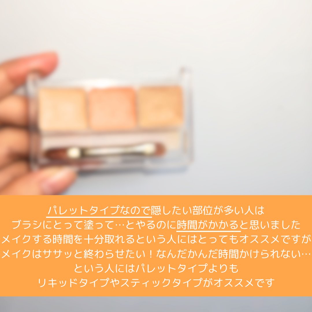 カバー力の高いコンシーラーを探してこの商品にたどり着きました。3色入っていて混ぜて使うことで他の用途にも使えるなら、あれこれと買わなくていいし便利じゃん! ハイカバーという名前の通りカバー力も高いですし、メイク持ちに関しても、頻繁に使っていますが崩れが気になったことがないので結構いい方だと思います。 色を使い分けることでマルチに使えるので、ニキビ跡隠しにはもちろん、眉の剃り跡隠しやクマ隠しにも使っています。