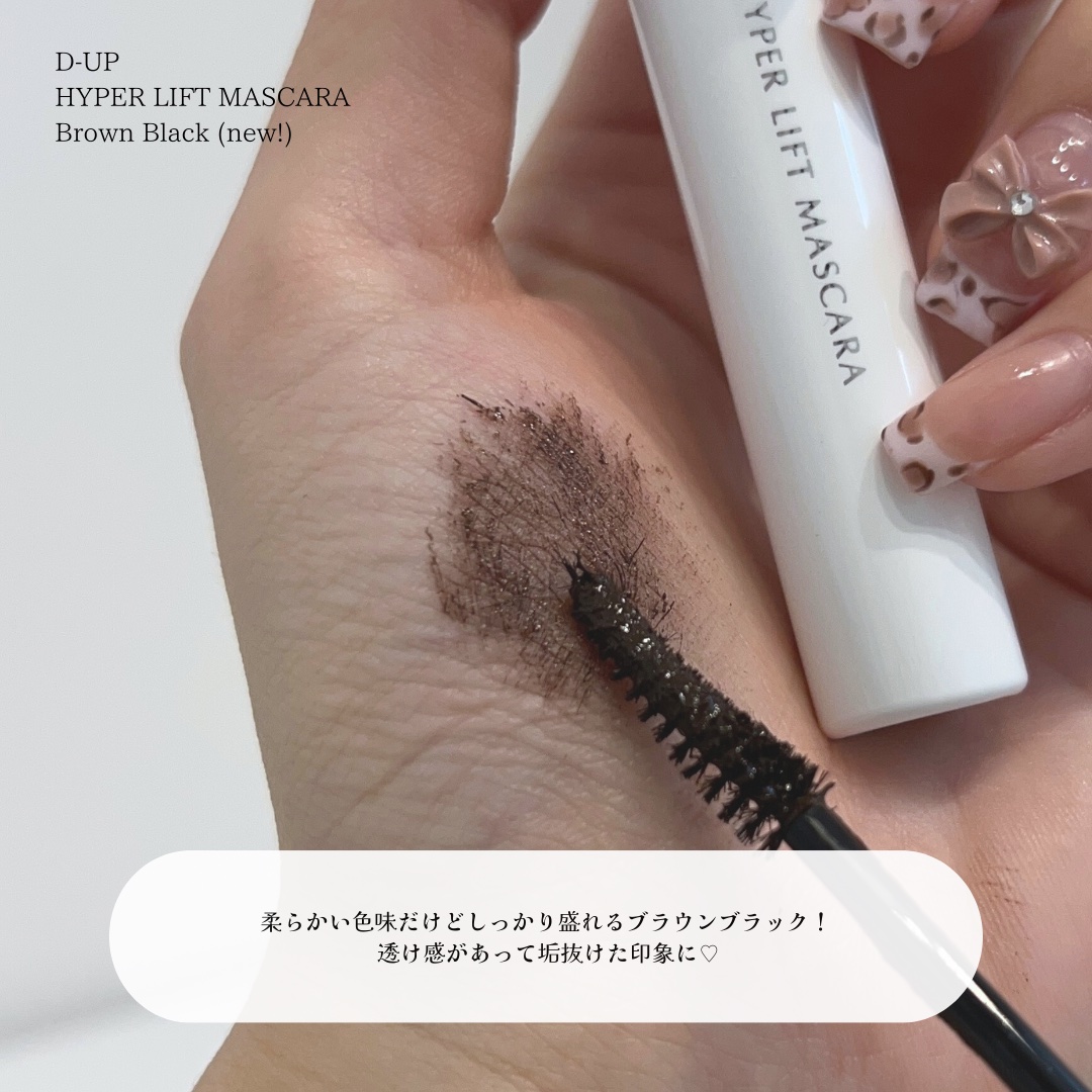 新色は「黒みブラウン」ということで、まつ毛の存在感を消さず、ブラウンの柔らかさを感じるけど目元も引き締まる絶妙なカラー! ダマになりにくくまつ毛につるんと塗布できるのですごく好きです✊🏻✨ 何よりも嬉しいのがカールキープ◎ D-upのお湯オフのマスカラよりもまつ毛がしっかり上がってくれてそこがすごくお気に入りポイントです🪄