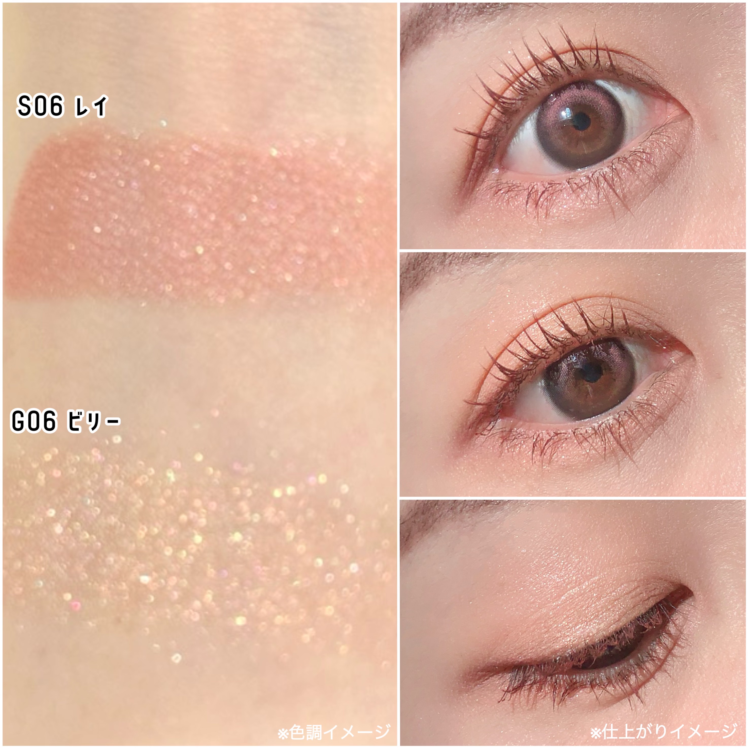 肌馴染みの良いスキントーンのピンクベージュ「レイ」とシャンパンのようなグリッターが繊細にきらめく「ビリー」 一見マットなんだけど、よーくみると細かいラメが入っていて、瞼にのせるとほんのりとしたツヤ感。 ラメ感の強いGシリーズの中では繊細でお上品な輝きだし、ラメもヴァレリーより透明感があるゴールド。