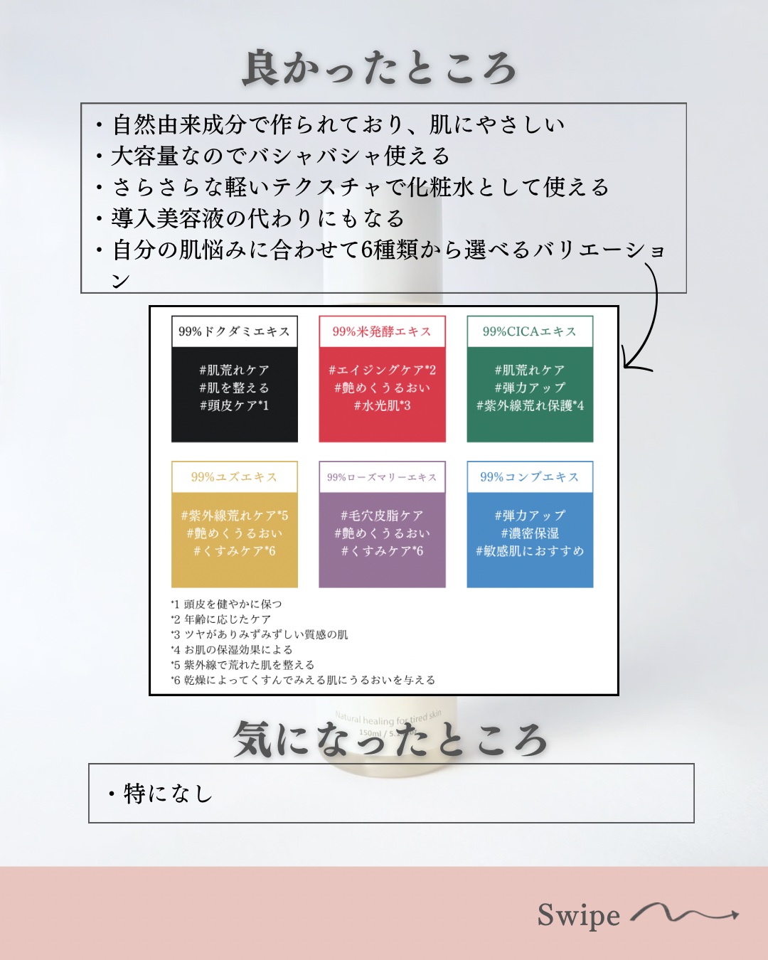 - 6種類の中から肌に合わせてセレクトできる韓国ナチュラルスキンケア。 精製水を配合していない99%美容保湿成分で作られているからしっかり時短ケア。韓国スキンケアでは定番となったツボクサ*やドクダミ*、人気の高いガラクトミセス*やコンブ*など、美容成分と良い香りで人気のユズ*、ローズマリー*と豊富なバリエーションが魅力。防腐剤には自然由来成分のみ配合。肌の気になる方もご利用いただけます。 *保湿成分