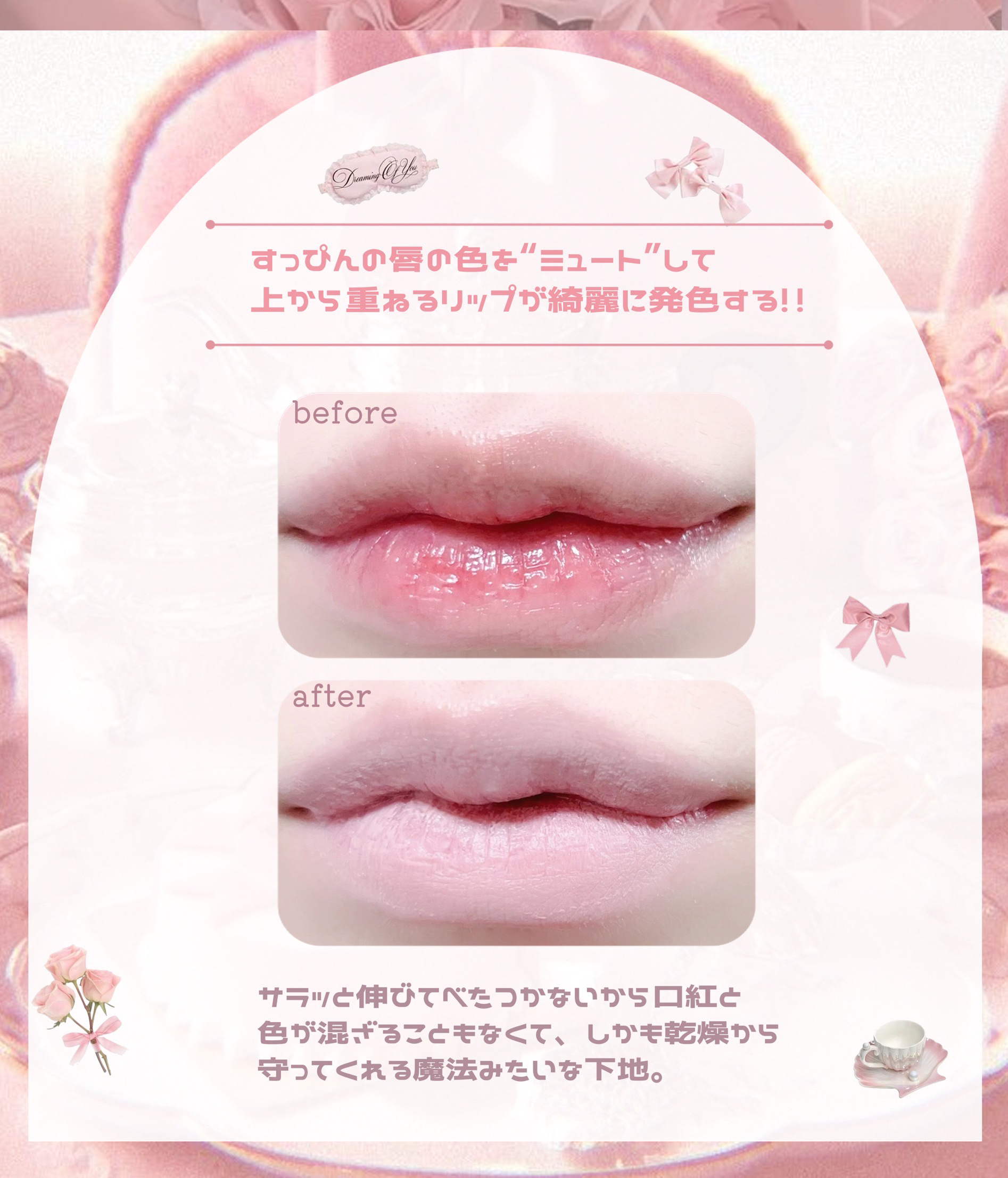 - 元のくちびるの色をミュートする 新発想のくちびる用下地 ●濃い色の唇の存在感を抑えて、生まれつきかのような淡い色のヌードリップに。 ●その後に重ねる口紅と混ざりづらく、ぴたっと密着。 ●チップで唇に伸ばした後は、トントンと指でなじませるだけで簡単に唇の色を補正。 ●唇の縦ジワをかくしてふっくらとした唇に。 ●5 種のうるおい美容成分で唇の乾燥を防ぎます。 ヒアルロン酸 Na・ホホバ種子油・ローヤルゼリーエキス・ビタミン C 誘導体(テトラへキシルデカン酸アスコルビル)・ビタミン E(トコフェロール) ●無香料 <このような方にオススメ> ■素のくちびる色が赤っぽい ■淡色リップが似合わない ■どのリップも同じ色になる <ご使用法> ■リップメイクの前に。チップに適量を取り、唇に塗布してください。 ■チップで唇全体に広げた後、指でトントンと軽くたたきこむようになじませるとより自然に仕上がります。