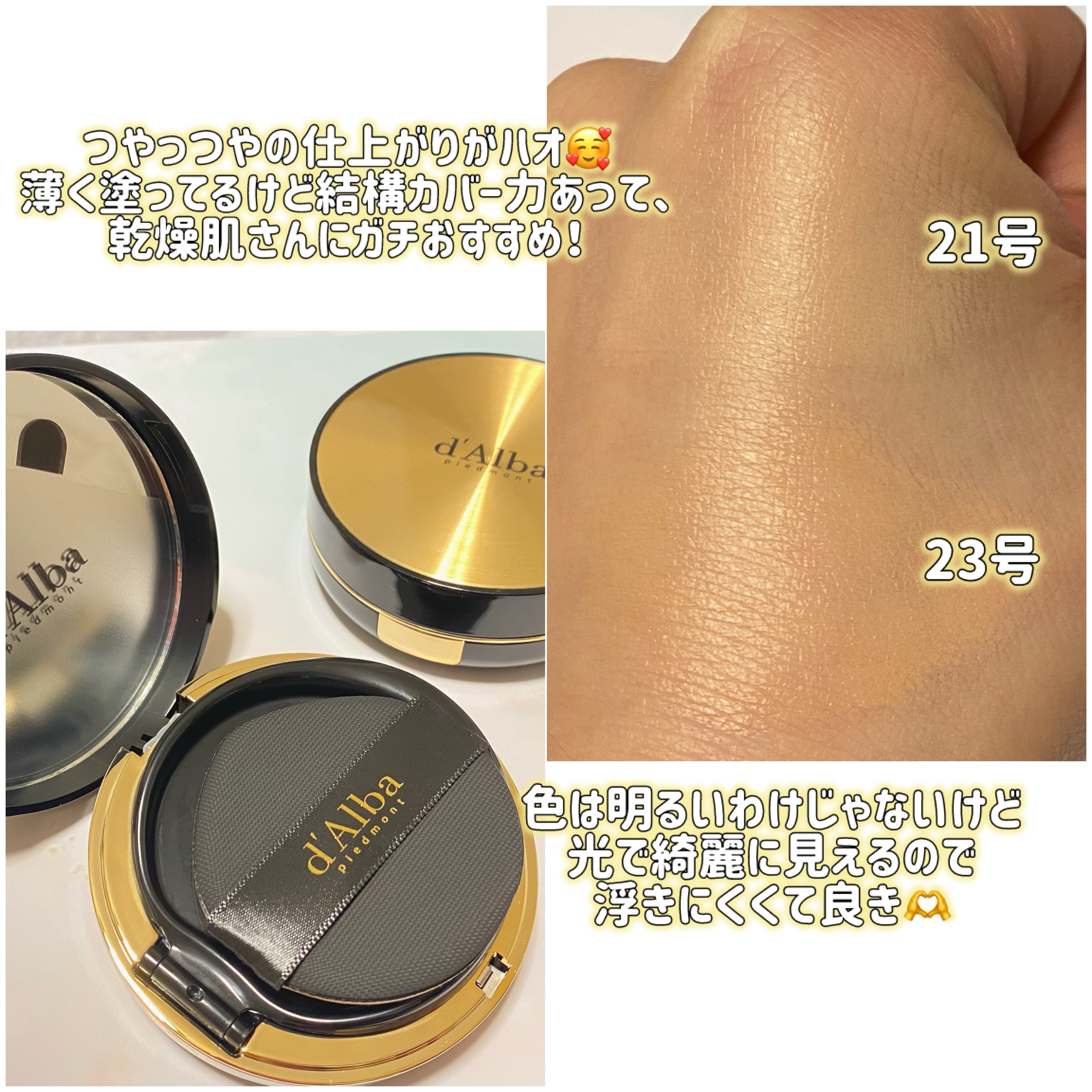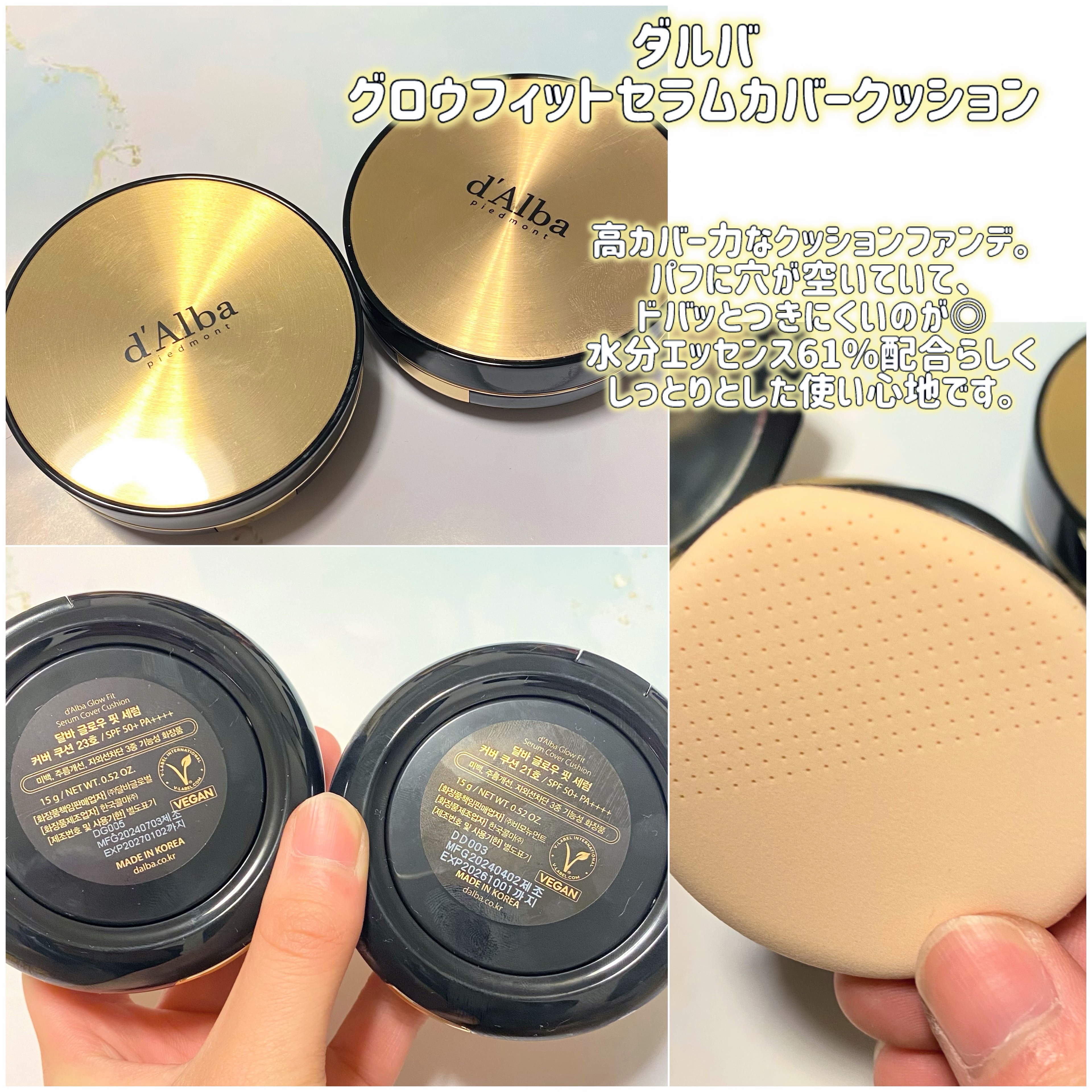 内側から発光するみたいなツヤ感が特徴で、メイク前はもちろん日中乾燥が気になる時にも使える商品です✨ ツヤ感を残しつつ高カバー力なクッションファンデです。水分エッセンス61%配合らしく、厚塗り感を感じないしっとりした仕上がり❣️ ダルバのクッションはカバー力も申し分なしなので是非ミストと合わせて試してみてください🫶