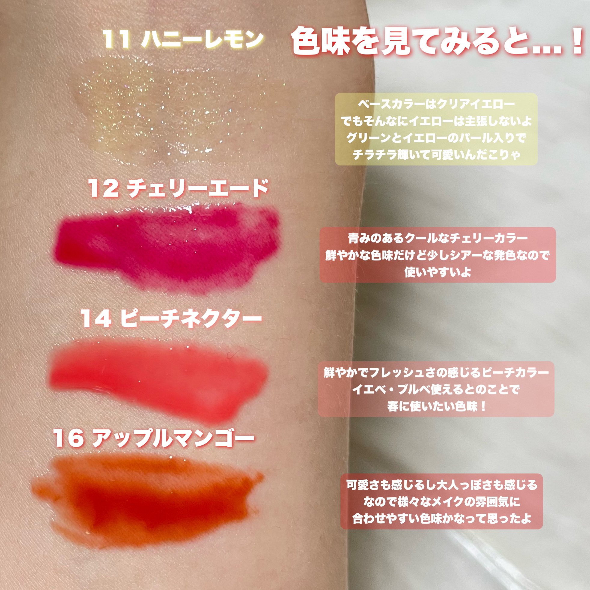 プランプ効果があって、唇にボリュームとツヤ感を演出してくれます。 ・11 ハニーレモン プランピングが強いタイプで、唇にボリュームを出してくれます。微細なラメが美しいです🫶一番お気に入り ・16 アップルマンゴー(日本限定) オシャレな色味で、モードな雰囲気もありつつ、透明感があるので使いやすいです。