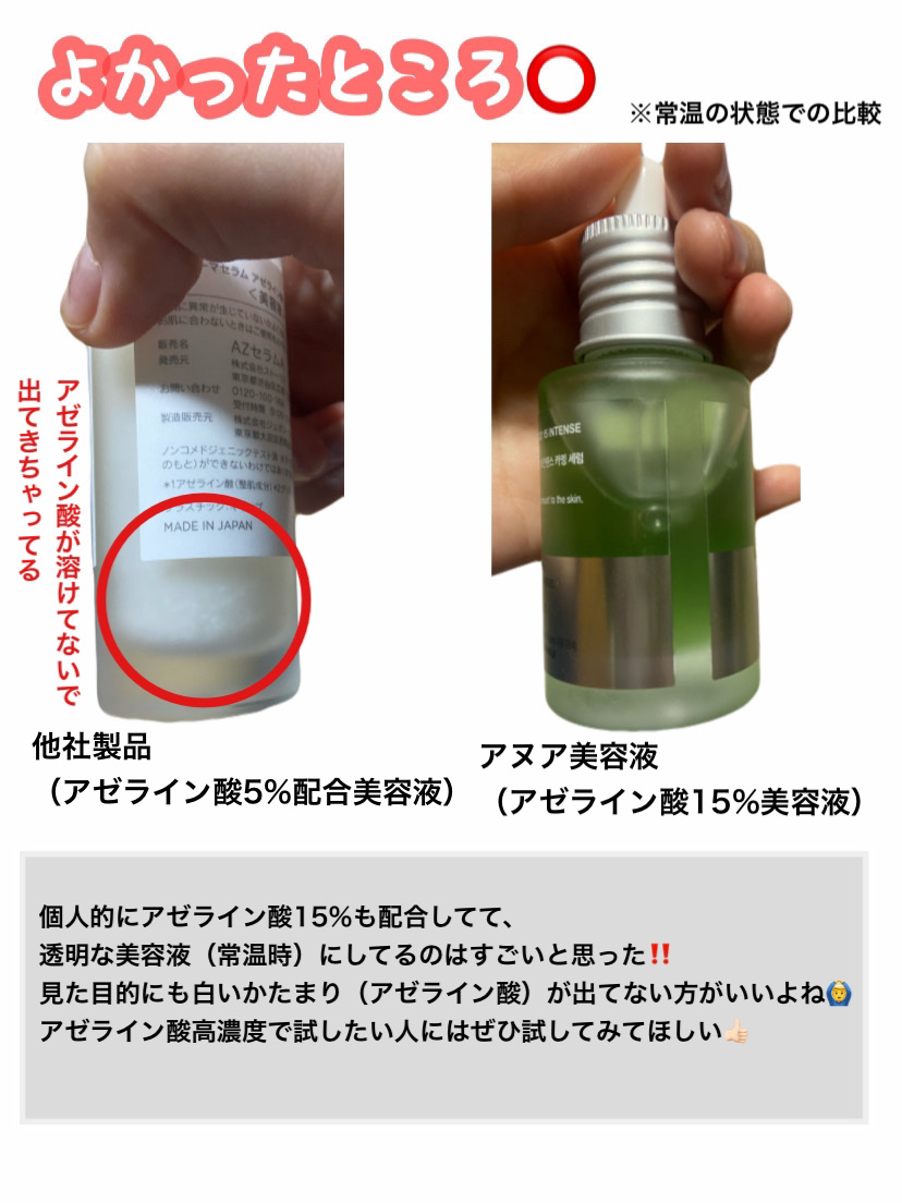 アゼライン酸は15%で効果がわかりやすいみたい✨ コスデバハは顔に塗った時にピリピリする感じがあったんだけど、こちらはそんなこともなく使えた(誰でも刺激感がないって意味じゃないので、敏感肌や乾燥肌の方は注意⚠️) アゼライン酸は皮脂のバランスを整えてくれるので、ニキビを防いでくれるし、毛穴も目立ちにくくしてくれる! アラフォーに近づくにつれて、頬の毛穴が気になり出してたんだけど、これを使ってかなり毛穴のケアができた✨ 乾燥はかなり感じやすかったので、保湿は重要! ヒアルロン酸やナイアシンアミドと相性◎なので、是非保湿アイテムと組み合わせて使ってみてね!