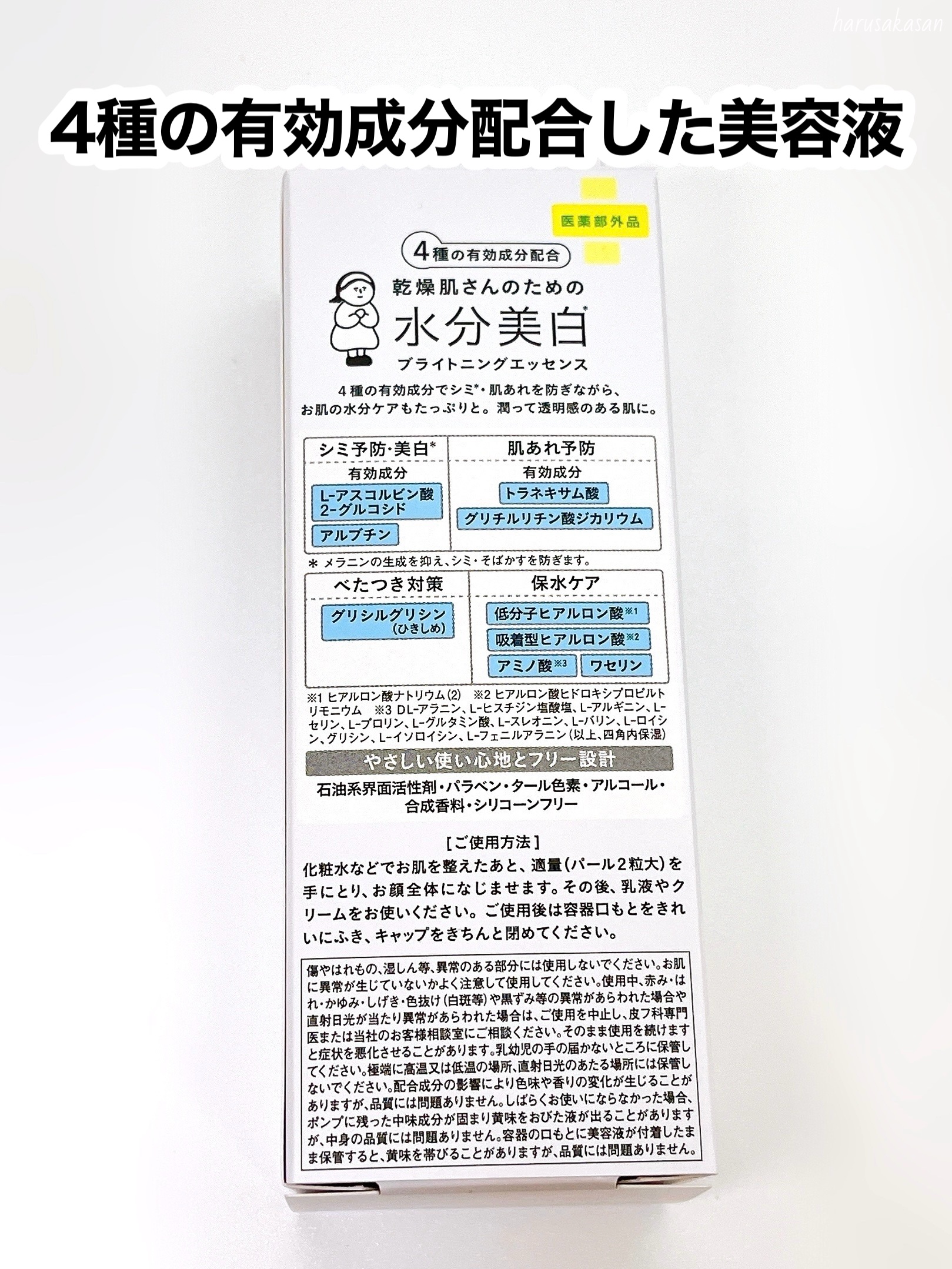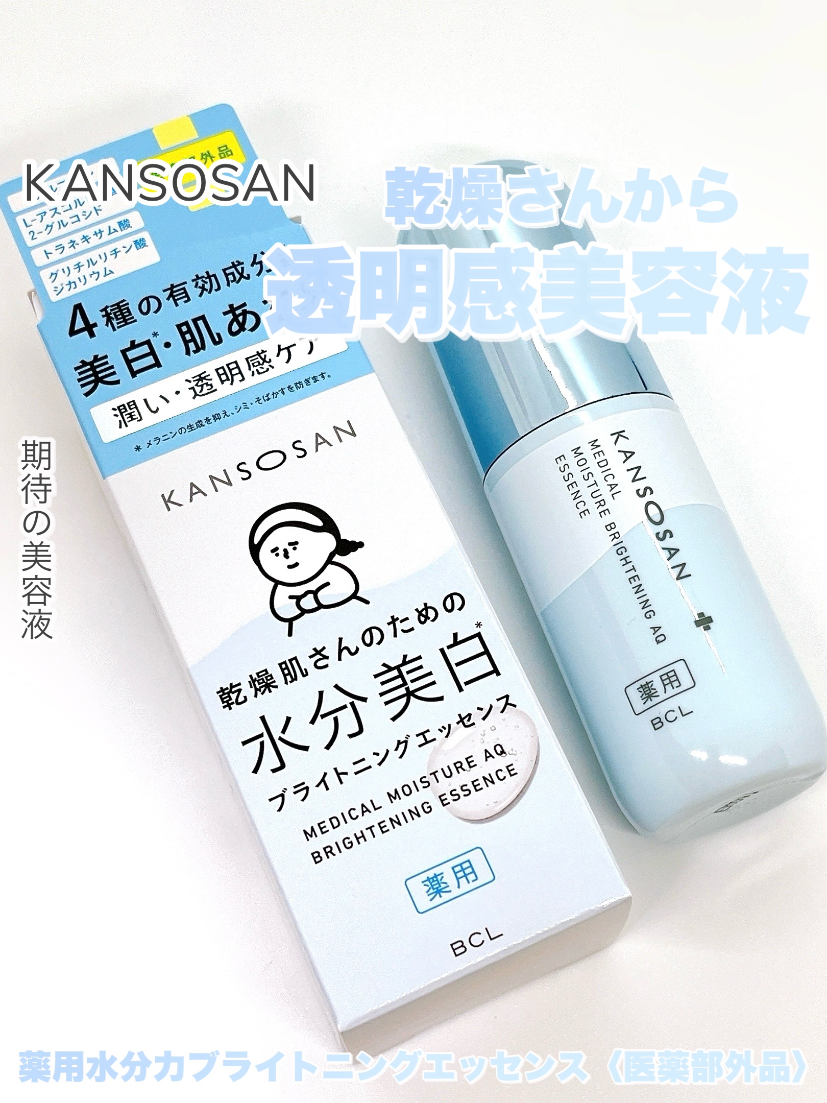 - ※2025年1月14日よりBCL ECサイト・一部企業にて先行発売 【医薬部外品】 乾燥による肌あれを防いで、潤いの透明肌へ! 4種の有効成分配合。薬用水分美白*1エッセンス 【配合成分】 シミ*1や肌あれを防ぎながら、透明感のある肌へ 4種の有効成分配合でシミ*1・肌あれを防ぎながら、肌の潤いを保ちます。 ●シミ*1予防・美白*1 有効成分:L-アスコルビン酸2-グルコシド、アルブチン ●肌あれ予防 有効成分:トラネキサム酸、グリチルリチン酸ジカリウム ●肌のべたつきを抑えながら、潤いもしっかりキープ 肌にたっぷり潤いを与えながら、乾燥によるベタつきを抑えます。 べたつき対策:グリシルグリシン(ひきしめ) 保水ケア:低分子ヒアルロン酸、吸着型ヒアルロン酸、アミノ酸、ワセリン ●やさしい使い心地とフリー設計 石油系界面活性剤、パラベン、ター、色素、アルコール、合成香料、シリコーン *1 メラニンの生成を抑え、シミ・そばかすを防ぎます。 *2 ヒアルロン酸ナトリウム(2) *3 ヒアルロン酸ヒドロキシプロピルトリモニウム *4 DL-アラニン、L-ヒスチジン塩酸塩、L-アルギニン、L-セリン、L-プロリン、L-グルタミン酸、L-スレオニン、 L- バリン、L-ロイシン、グリシン、L-イソロイシン、L-フェニルアラニン(以上、全て保湿)