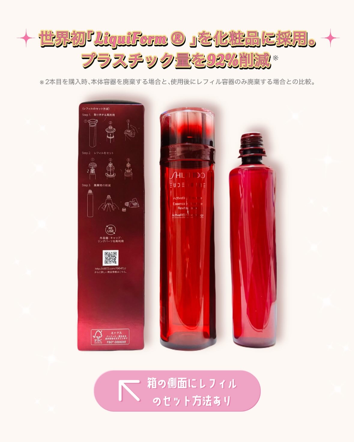 - あなたの美しさを日々、更新。 生命感あふれるつややかな肌が続く。 今まで発揮しきれていない、美の回復に着目。乾燥や環境変化に負けない、美しい肌サイクルを目指して、悪いものを取り除き、良いものを取り入れる習慣を。 角層のすみずみまで素早く浸透し、乾燥による小ジワを目立たなくします*。 輝くような透明感と、うるおったなめらかな肌へ導きます。 *効能評価試験済み <使用方法> ●朝と夜、洗顔の後、適量を手のひら、またはコットンにとり、顔全体にていねいになじませます。 <レフィルの正しいセット方法> ・新しいレフィルに、再利用するリングパーツをはめてから、外容器にセットをします。 ・リングパーツをはめる前にレフィルを外容器に入れると正しくレフィルがセットできないため、中味が漏れる可能性があります。 ※リングパーツを水平にし、レフィルの首元にカチっと音がするまで押し込んでください。