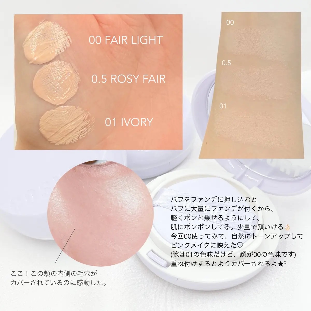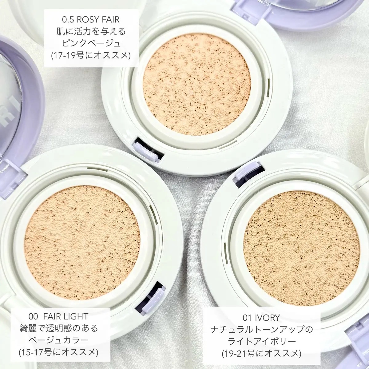 - <00 フェアライト> 水、酸化亜鉛、シクロペンタシロキサン、ホモサレート、安息香酸アルキル(C12-15)、サリチル酸エチルヘキシル、ジ(カプリル/カプリン酸)BG、BG、フェニルトリメチコン、ラウリルPEG-10トリス(トリメチルシロキシ)シリルエチルジメチコン、ダイマージリノール酸ダイマージリノレイル、ナイアシンアミド、トリメチルシロキシケイ酸、パンテノール、硫酸Mg、セチルPEG/PPG-10/1ジメチコン、合成フルオロフロゴパイト、マイクロクリスタリンワックス、ジステアルジモニウムヘクトライト、水酸化Al、トリエトキシカプリリルシラン、1,2-ヘキサンジオール、ステアリン酸、カプリル酸ソルビタン、ラウロイルリシン、カプリル酸グリセリル、ベルガモット果実油、エチルヘキシルグリセリン、アデノシン、ラベンダー油、ローマカミツレ花油、トコフェロール、テトラ(ジ-t-ブチルヒドロキシヒドロケイヒ酸)ペンタエリスリチル、テルミナリアフェルジナンジアナ果実エキス、酸化チタン、酸化鉄 <0.5 ロージーフェア> 水、酸化亜鉛、シクロペンタシロキサン、ホモサレート、安息香酸アルキル(C12-15)、サリチル酸エチルヘキシル、ジ(カプリル/カプリン酸)BG、BG、フェニルトリメチコン、ラウリルPEG-10トリス(トリメチルシロキシ)シリルエチルジメチコン、トリメチルシロキシケイ酸、ダイマージリノール酸ダイマージリノレイル、ナイアシンアミド、パンテノール、合成フルオロフロゴパイト、硫酸Mg、セチルPEG/PPG-10/1ジメチコン、マイクロクリスタリンワックス、ジステアルジモニウムヘクトライト、水酸化Al、トリエトキシカプリリルシラン、1,2-ヘキサンジオール、ステアリン酸、カプリル酸ソルビタン、ラウロイルリシン、カプリル酸グリセリル、ベルガモット果実油、エチルヘキシルグリセリン、アデノシン、ラベンダー油、ローマカミツレ花油、トコフェロール、テトラ(ジ-t-ブチルヒドロキシヒドロケイヒ酸)ペンタエリスリチル、テルミナリアフェルジナンジアナ果実エキス、酸化チタン、酸化鉄 <01 アイボリー> 水、酸化亜鉛、シクロペンタシロキサン、ホモサレート、安息香酸アルキル(C12-15)、サリチル酸エチルヘキシル、ジ(カプリル/カプリン酸)BG、BG、フェニルトリメチコン、ラウリルPEG-10トリス(トリメチルシロキシ)シリルエチルジメチコン、ナイアシンアミド、ダイマージリノール酸ダイマージリノレイル、トリメチルシロキシケイ酸、パンテノール、合成フルオロフロゴパイト、硫酸Mg、セチルPEG/PPG-10/1ジメチコン、ジステアルジモニウムヘクトライト、マイクロクリスタリンワックス、水酸化Al、トリエトキシカプリリルシラン、1,2-ヘキサンジオール、ステアリン酸、カプリル酸ソルビタン、ラウロイルリシン、カプリル酸グリセリル、ベルガモット果実油、エチルヘキシルグリセリン、アデノシン、ラベンダー油、ローマカミツレ花油、トコフェロール、テルミナリアフェルジナンジアナ果実エキス、酸化チタン、酸化鉄
